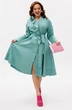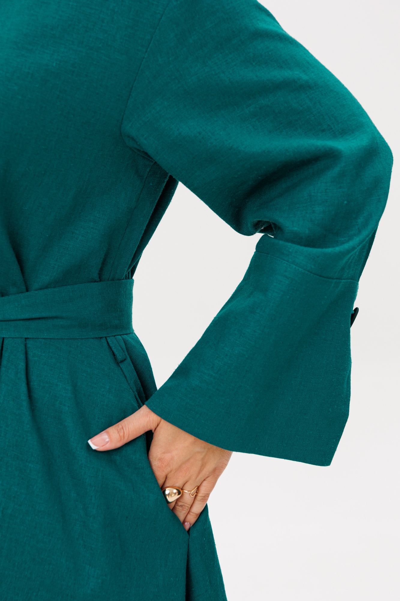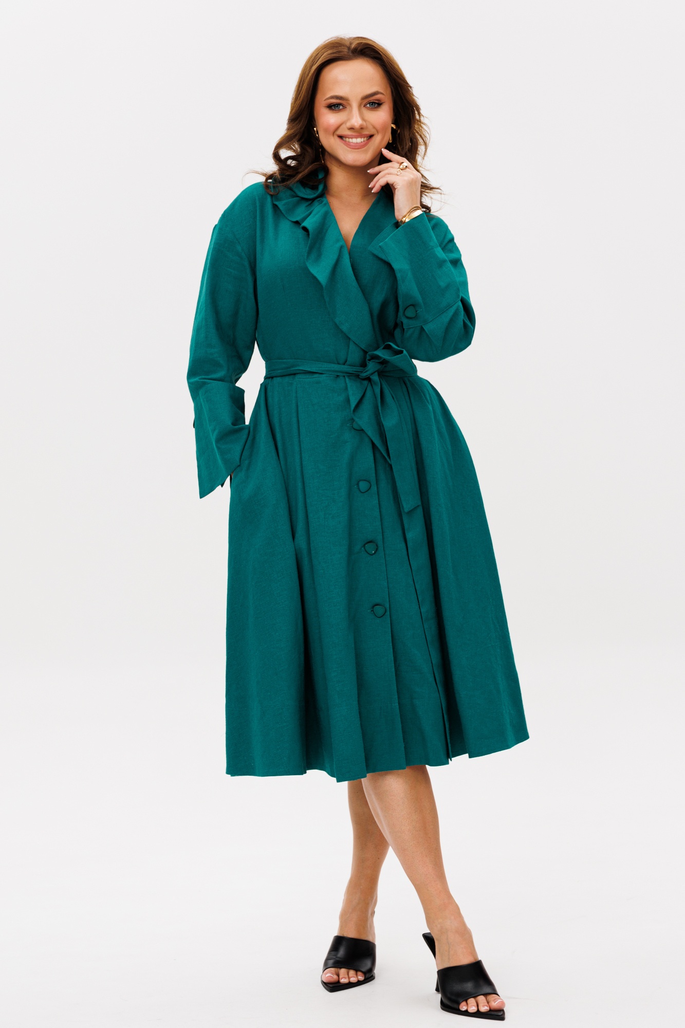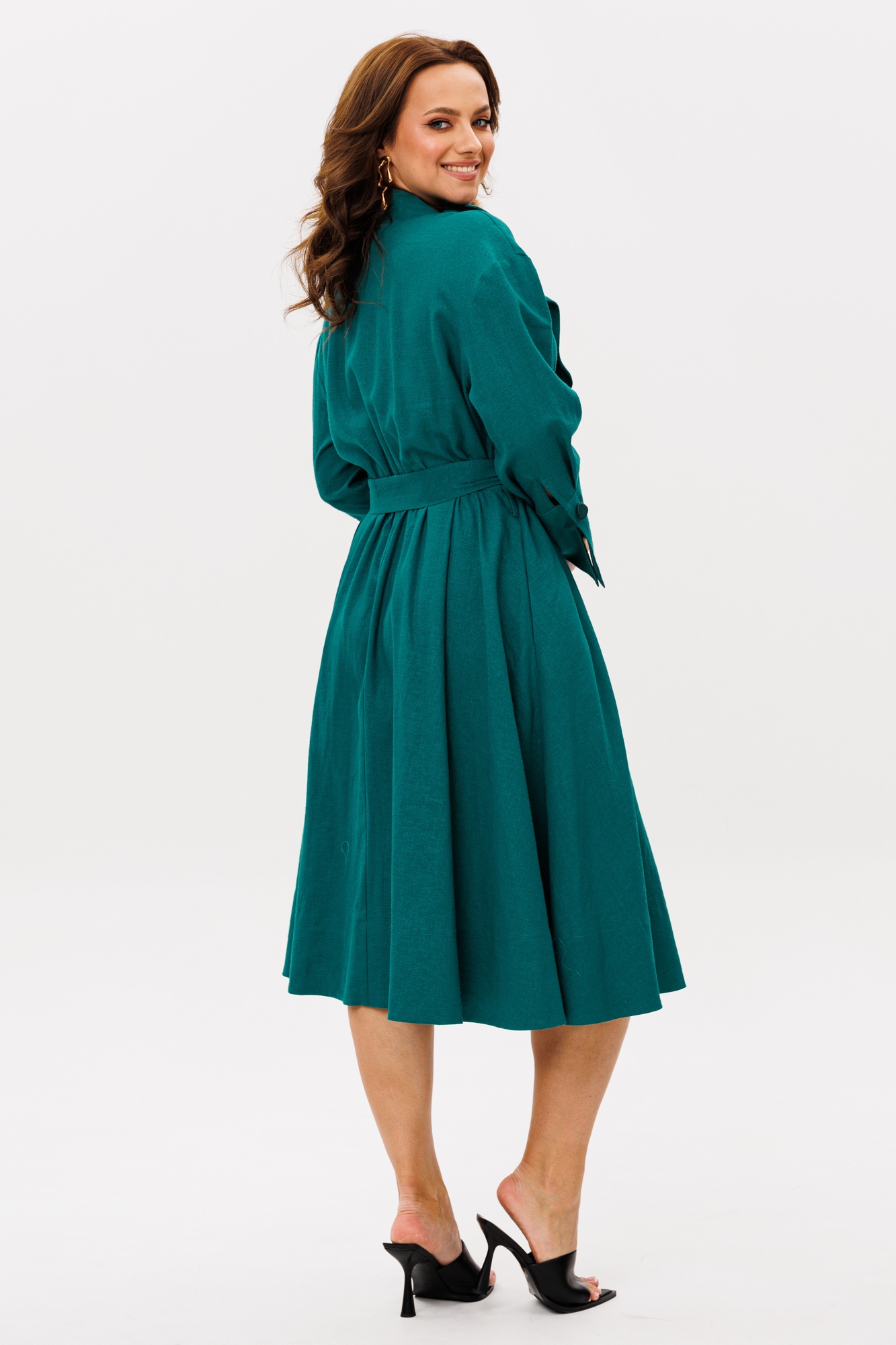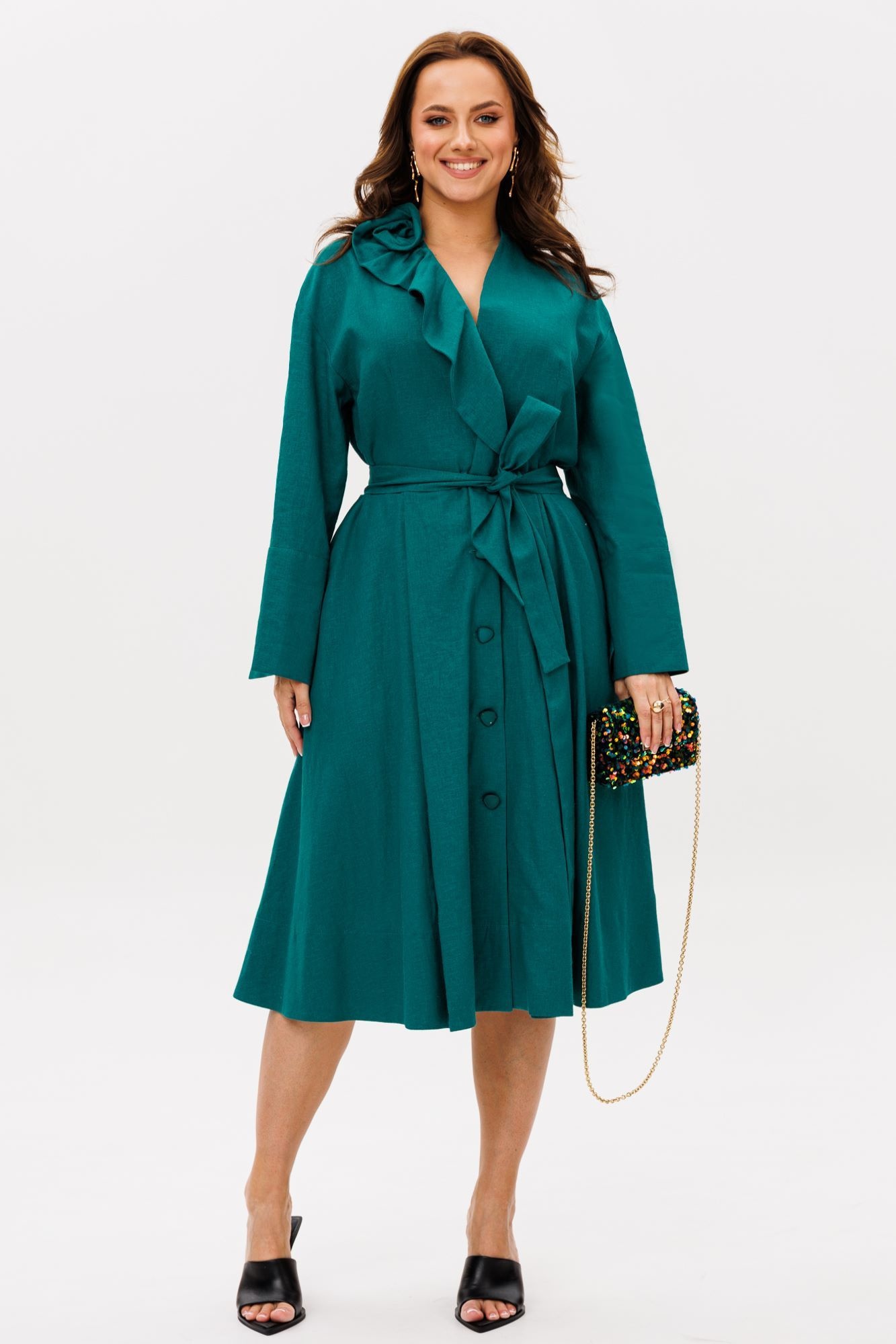 Элегантное женское палтье из натуральной ткани (лен, хлопок) необычного кроя станет изюминкой вашего гардероба. Платье прилегающего силуэта, отрезное по линии талии, по передеу застежка на петли и пуговицы, в верхней части платья по полочке прилегание создается за счет талиевых выточек, по спинке - за счет резинки по линии талии. Юбка-полусолнце с односторонними складками, по бокам карманы. Плечо спущенное, рукав укороченный, на высокой манжете на одну пуговицу. Горловина по полочке выполненна в виде цельнокроеной стойки, переходящей в отрезную по спинке. В качестве декора по краю борта идет жабо, переходящее в цветок. . В комплекте съемный пояс в тон платья. Длина по спинке:-111см. Длина рукава с манжето -51см.
