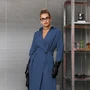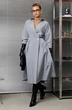 Элегантное женское платье из костюмной ткани необычного кроя станет изюминкой вашего гардероба. Платье полуприлегающего силуэта, отрезное по линии талии со спущенным плечом. Рукав 3/4 длиный на отрезной манжете. По полочке идут защипы-складки в верхней и нижней частях, запах - на петли и пуговицы по подрезу. По нижней части платья запах идет в виде складки. По спинке кокетка со складкой, по подрезу вставлена резинка. Юбка-полусолнце с односторонними складками по полочке, по бокам карманы. По горловине воротник на отрезной стойке. Платье будет идеально смотреться с туфлями, ботинкаи и сапогами. ВНИМАНИЕ! Пуговицы могут отличаться от фото. Длина по спинке: 117см. Длина рукава с манжето 29см.