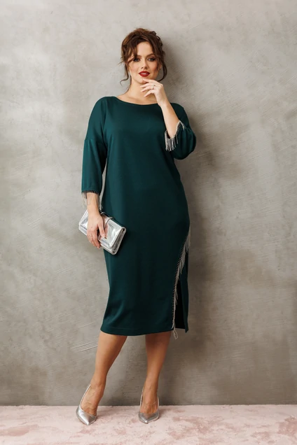 Платье миди — не просто одежда, это заявление о вашем стиле и вкусе. Элегантное праздничное платье прямного силуэта из трикотажного полотна. Ткань не мнется. Благодаря своему крою подойдёт для разных типов фигуры. Оно подчеркнёт вашу индивидуальность и станет отличным дополнением к вашему гардеробу. В нём вы будете чувствовать себя уверенно и комфортно, зная, что выглядите на все сто. Выбирая его, вы выбираете качество, комфорт и стиль. Классическое платье прямого силуэта, со спущенным плечом. По переду идет подрез с разрезом. В качестве декора по подрезу и низу рукава- металлизированная бахрома. По спинке идет средний шов. Такое платье незаменимая вещь в любом гардеробе. Длина платья по спинке (48-52) - 108см, (54-58) - 112 см. Длина рукава: (48-58) - 24 см.