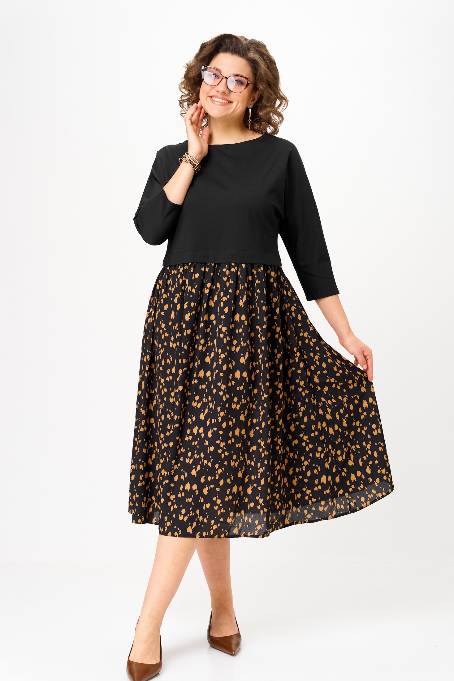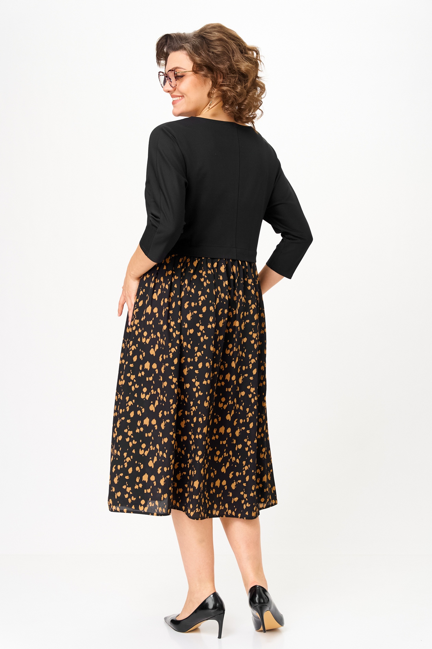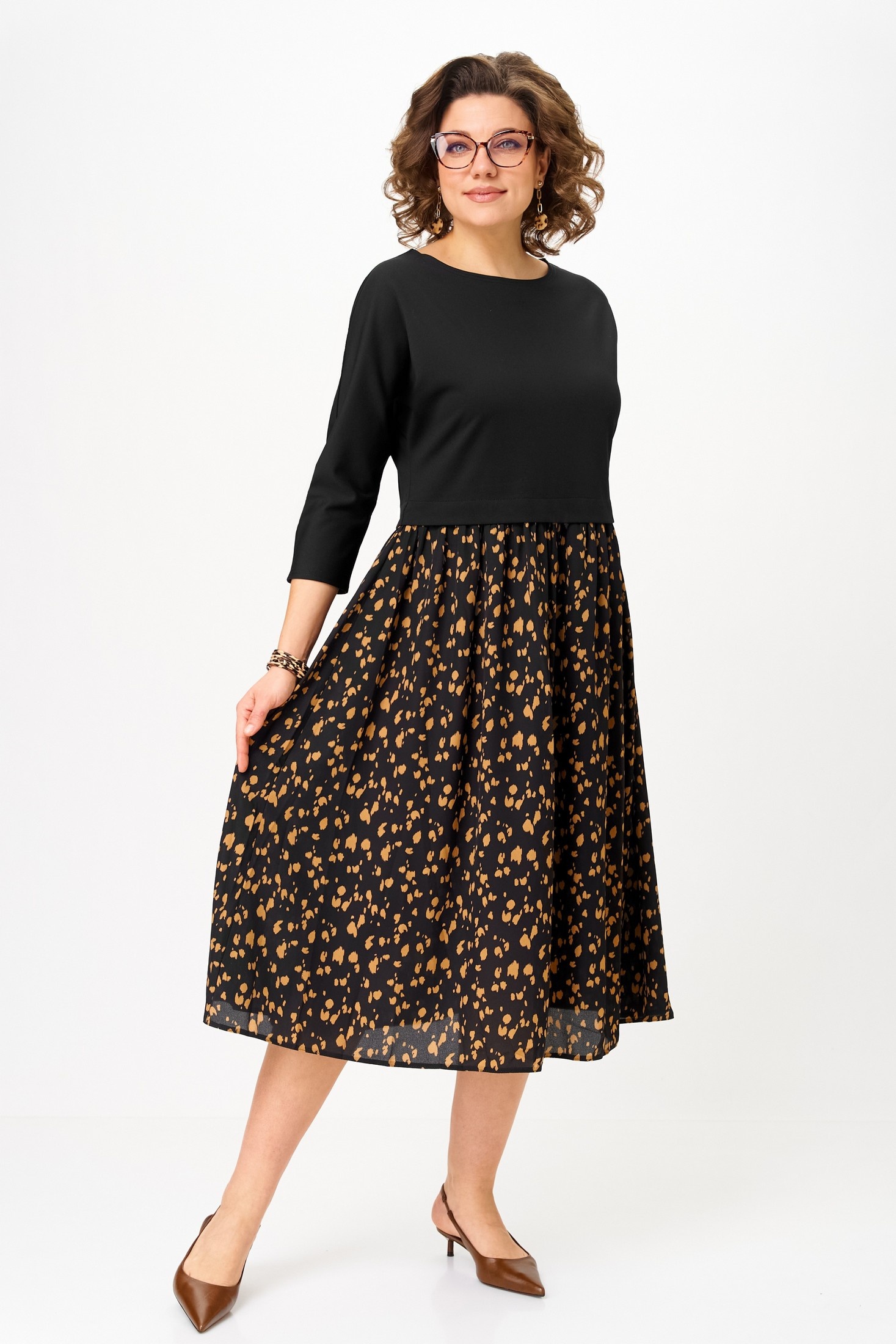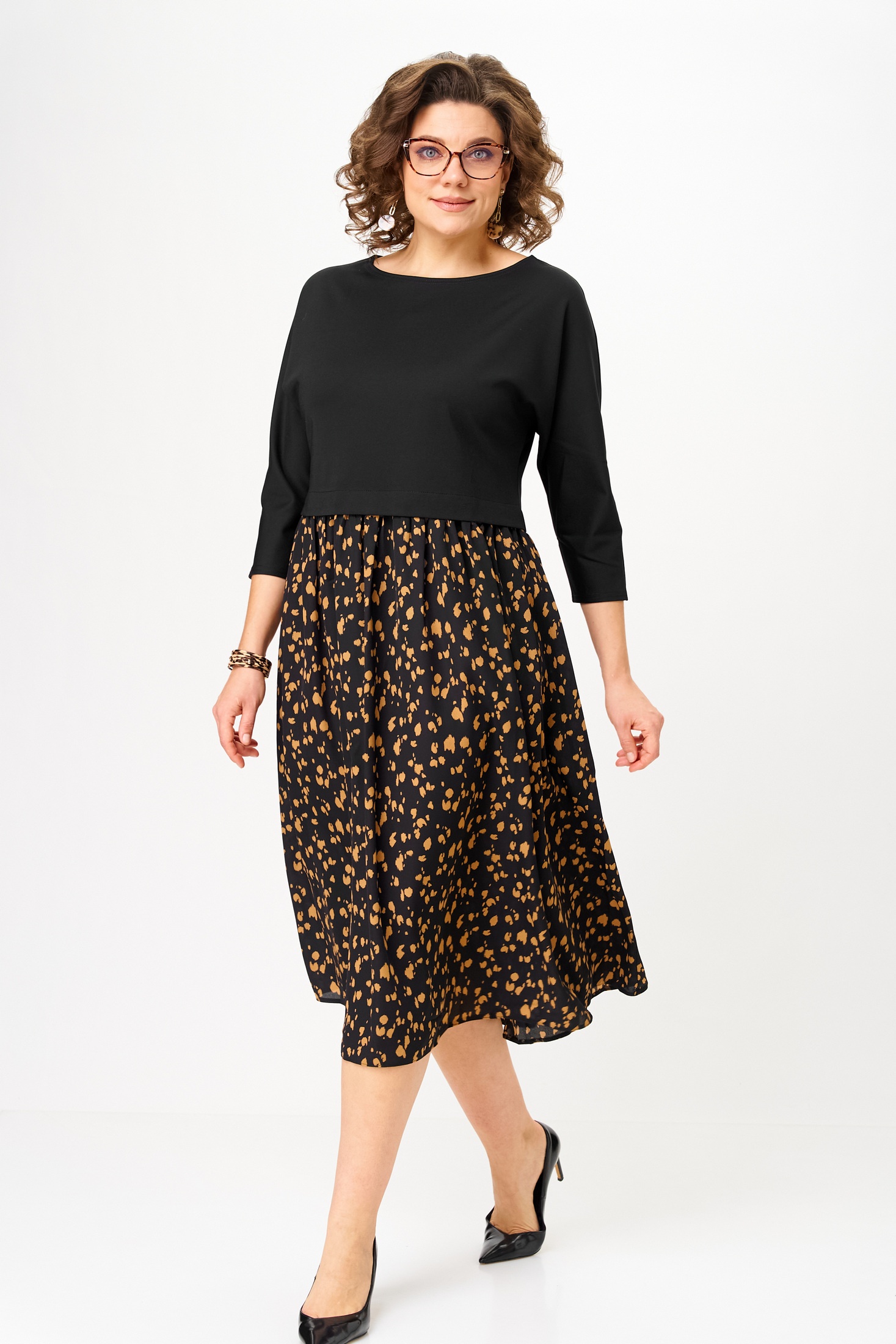 Платье 1309-1 черный+принт Anastasia — это стильное женское платье, созданное для повседневных и праздничных мероприятий. Коллекция бренда Anastasia предлагает высококачественное изделие с комфортным кроем. Верх выполнен из полиэстера с добавлением спандекса, обеспечивающего эластичность и легкость, низ — из чистого полиэстера. Платье отрезное по линии талии со сборкой и рукавами длиной 3/4 типа 'летучая мышь', что делает его идеальным для межсезонья. Средний шов на спинке и черно-печатный дизайн придают образу оригинальность. Длина по спинке достигает 115-120 см, делая его отличным выбором для любой фигуры.