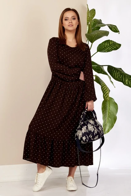 Платье женское из текстильной ткани в горошек. Платье отрезное по линии талии, юбка присобрана.По полочке идут выточки. Горловина овальной формы, окантована. Рукав втачной,одношовный длинный. По низу рукава резинка.По низу платья широкий присобранный волан. Длина платья: (48-52)-122см., (54-58)-124см. Длина рукава: (48-52)-62см., (54-58)-63см.