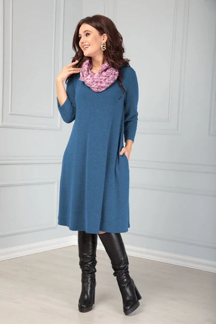 Платье женское трапециевидного силуэта, из трикотажного полотна. Платье по переду цельное, расширенное к низу, по боковым швам карманы полуовальной формы. Спинка платья стачная, расширенная к низу. Рукав-длиной 3/4 ,втачной,одношовный. Шарфик в комплект не входит. Горловина овальной формы. Длина изделия: (48-54)-96см.(56-62)-103 см.,
