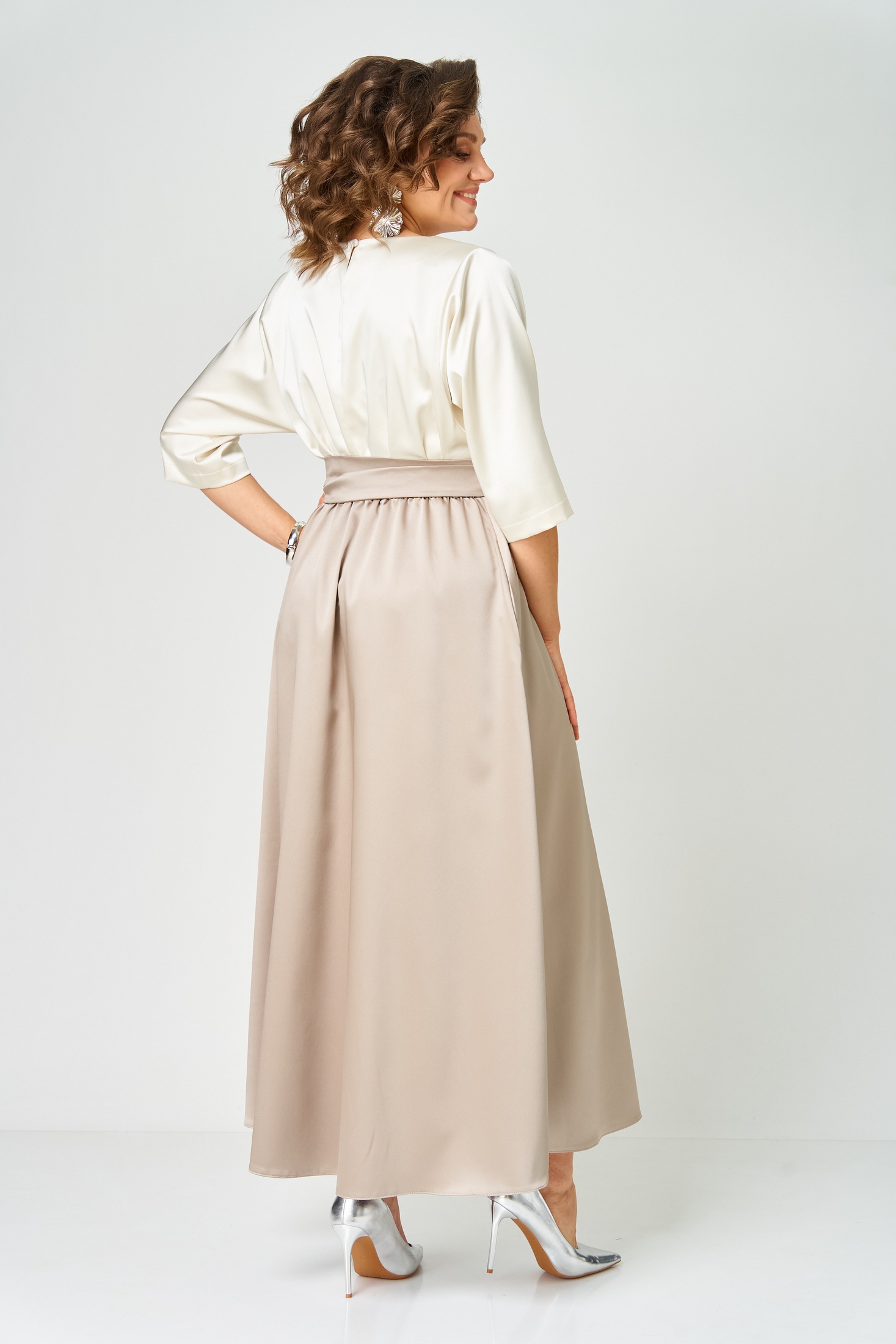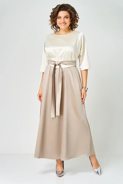 Платье 1229 молочный+капучино ANASTASIA MAK. Это элегантное макси-платье из коллекции бренда ANASTASIA MAK выполнено из ткани с атласным блеском, которая придаёт образу утончённость. Платье подчеркнуто акцентом на талии благодаря съемному поясу-кушаку, продетому через шлёвки. Овальная горловина и 3/4 одношовные рукава добавляют классическую ноту образу. Юбка-колокол с карманами в боковых швах обеспечивает комфорт и женственность. Платье идеально подходит для торжественных мероприятий в любое время года благодаря своему нейтральному, молочно-капучиновому цвету и универсальному стилю.