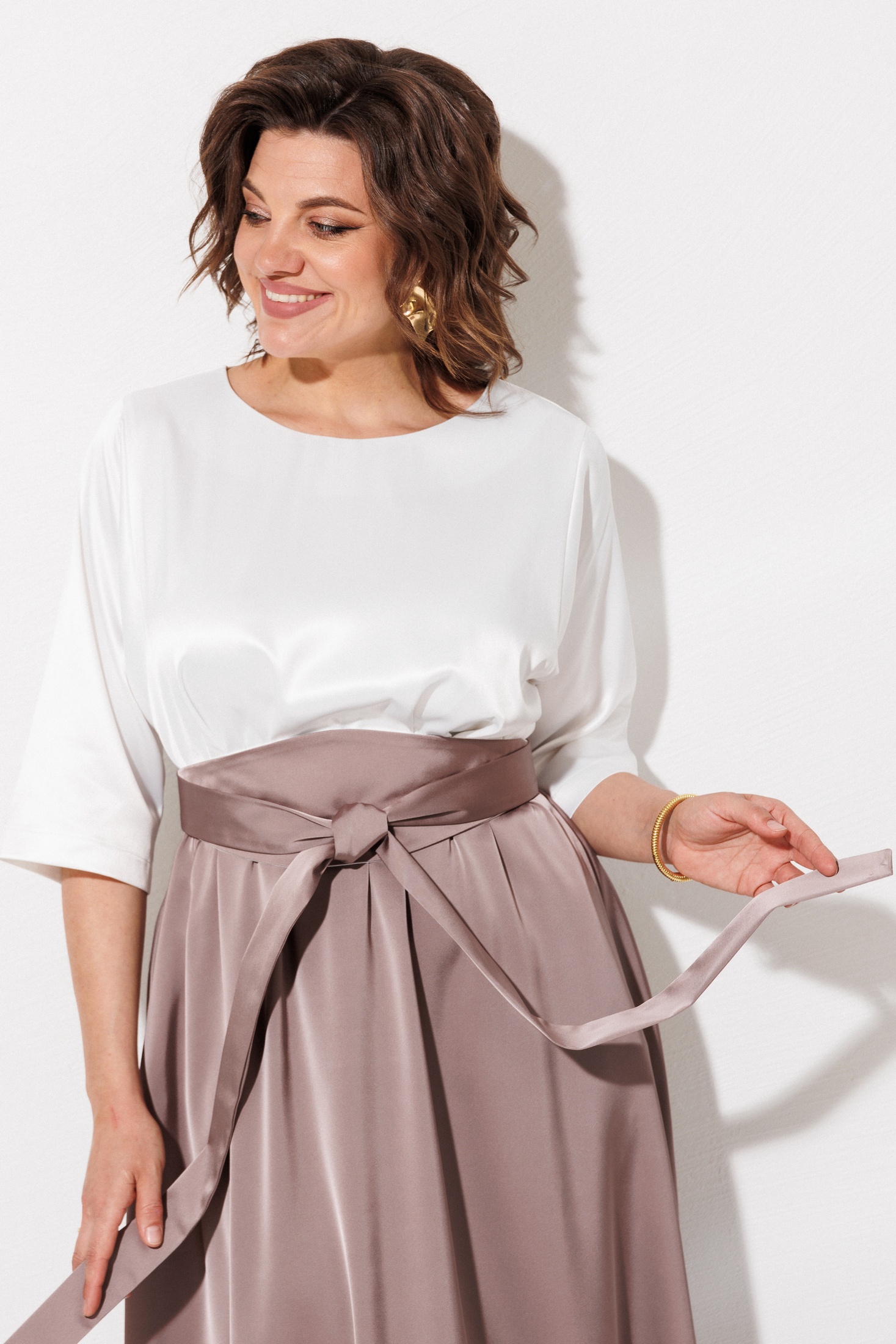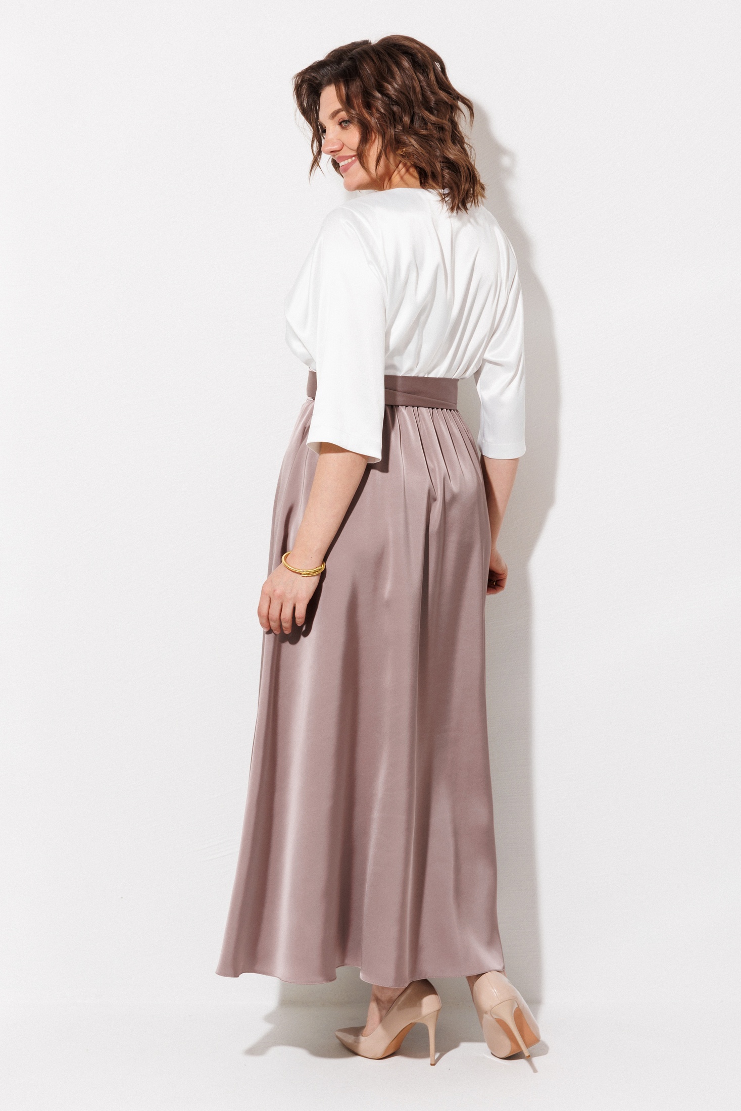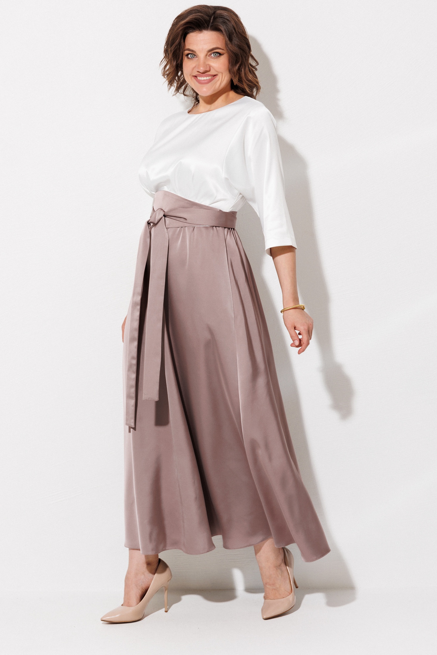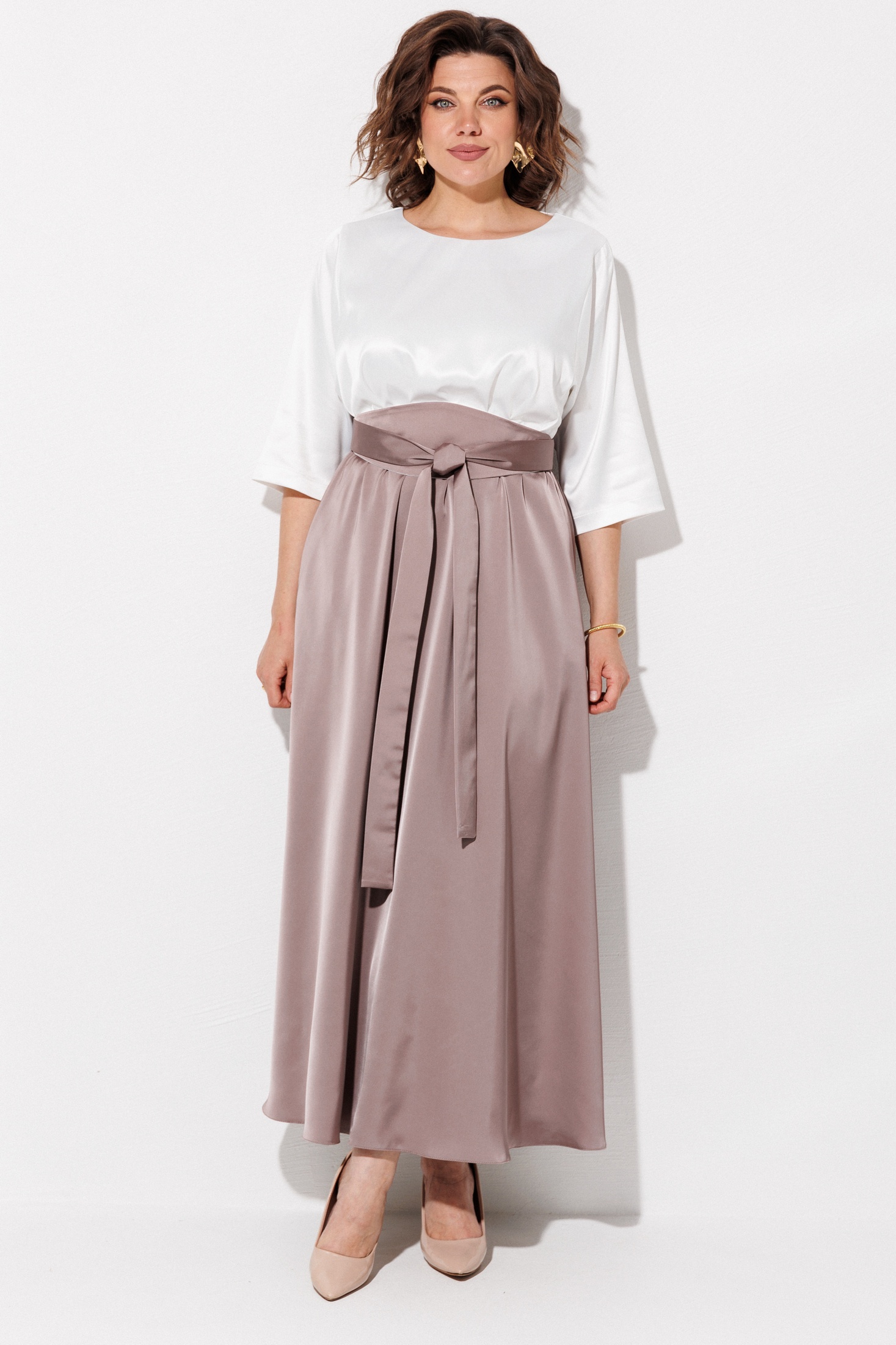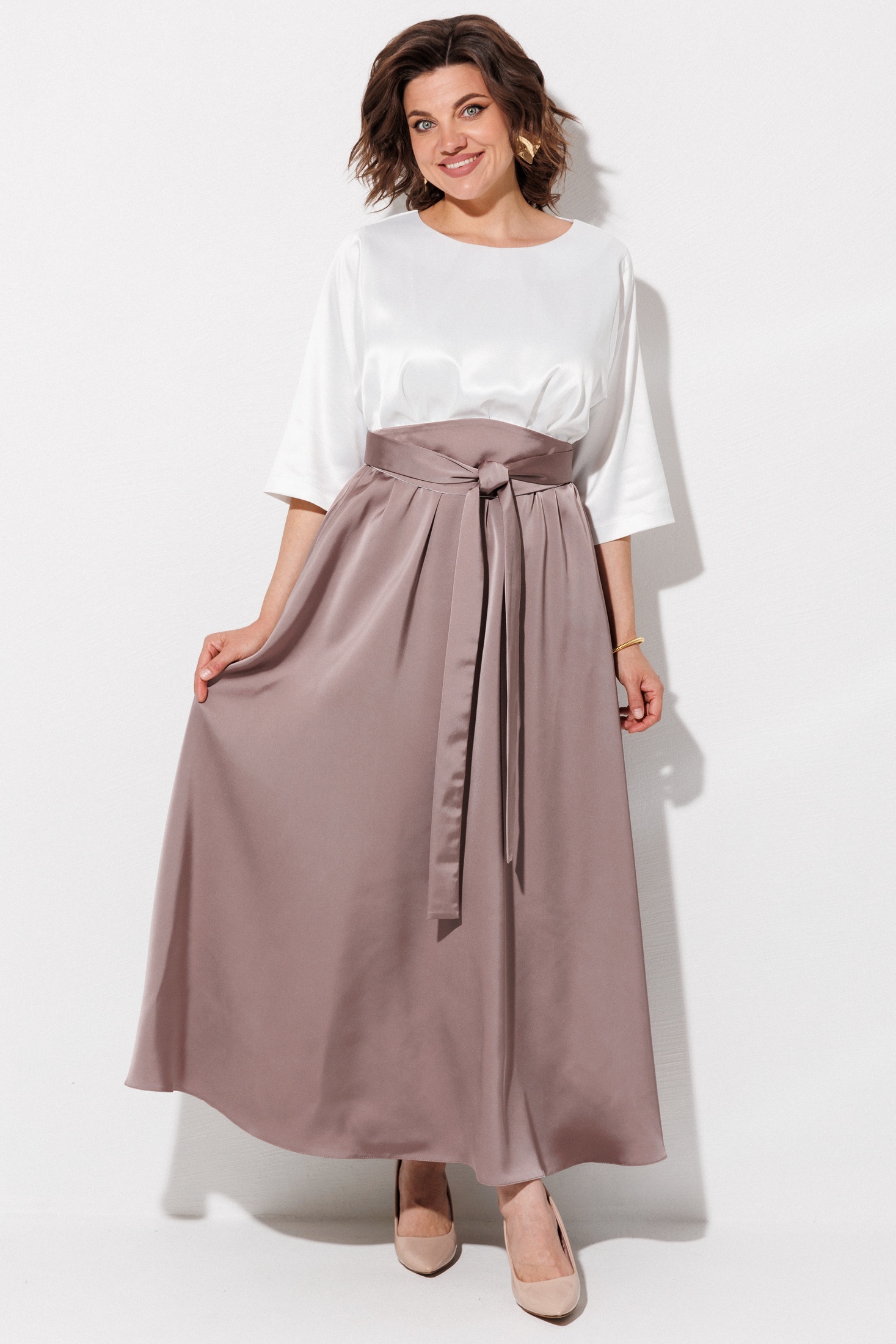 Платье 1229 жемчужный + капучино ANASTASIA MAK — это элегантное решение для современного гардероба. Коллекция бренда ANASTASIA MAK предлагает макси-платье в двух цветах с атласным эффектом, акцентирующее внимание на талии благодаря съемному поясу 'кушак'. Изготовлено из 100% полиэстера, что обеспечивает легкость и комфорт. Дизайн платья включает овальную горловину, рукава длиной 3/4 и юбку-колокол с карманами в боковых швах. Эластичная тесьма по талии и застежка на спинке обеспечивают идеальную посадку. Идеально подходит для осенне-весеннего сезона на вечерние выходы или особые случаи.