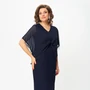 Платье отрезное по линии талии. Полочка с иммитацией запаха и складками по линии талии. Горловина V-образной формы. Спинка с талиевыми вытачками. Рукав втачной, обьемный к низу, с драпировкой. Юбка полуприлегающая по бедрам, свободная и широкая по низу. По боковым швам в области талии настрочены шлевки, через которые продет пояс, крепящийся на пуговицу.