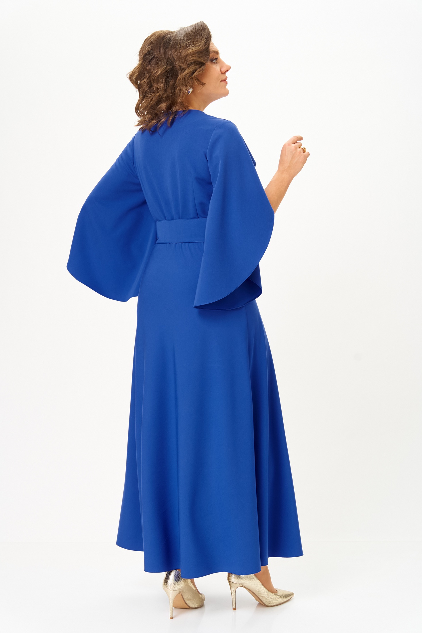 Платье отрезное по линии талии. Полочка с иммитацией запаха и складками по линии талии. Горловина V-образной формы. Спинка с талиевыми вытачками. Рукав втачной, обьемный к низу, с драпировкой. Юбка полуприлегающая по бедрам, свободная и широкая по низу. По боковым швам в области талии настрочены шлевки, через которые продет пояс, крепящийся на пуговицу.