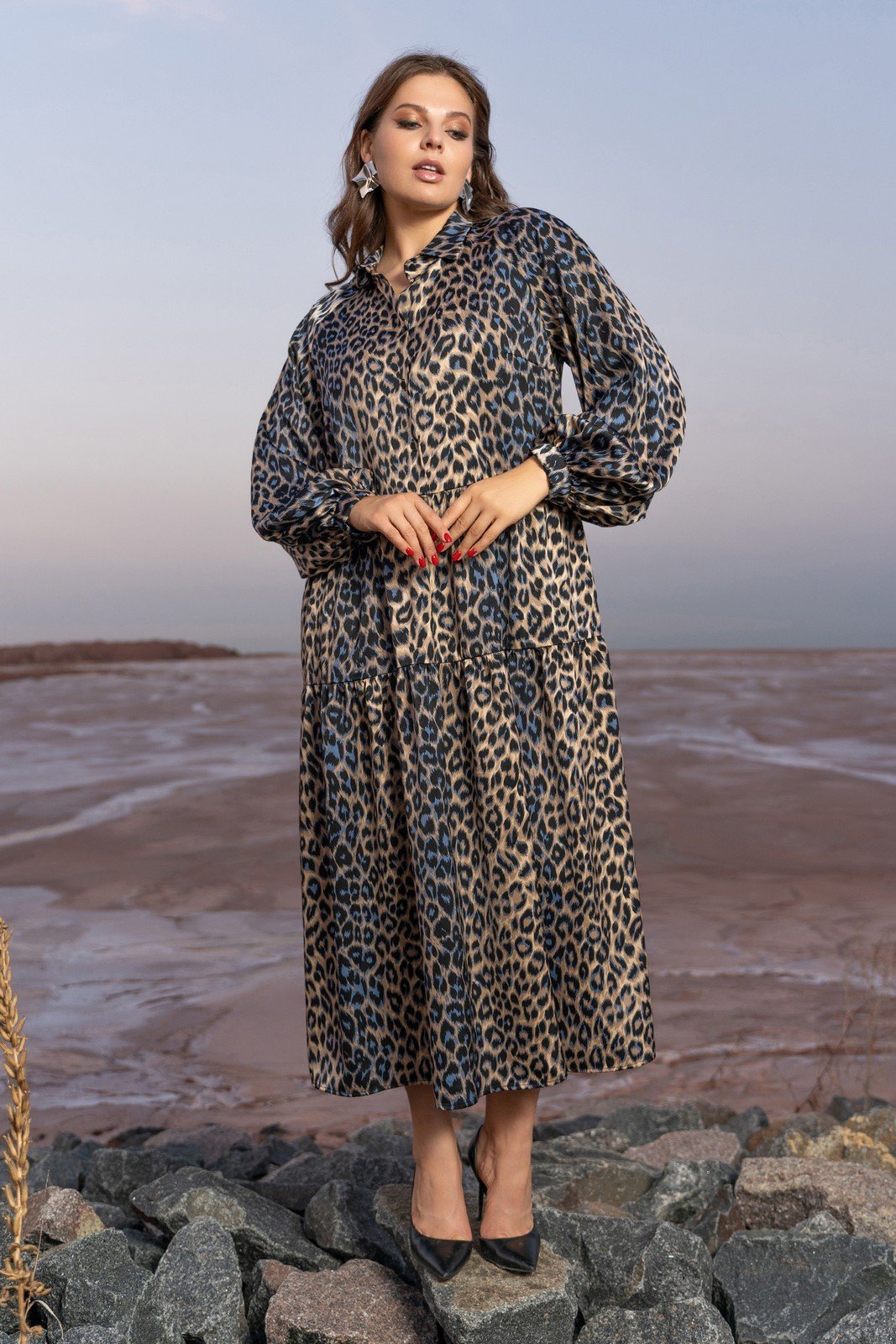 Элегантное платье-трапеция в стиле "бохо" украшено модным животным принтом в сочетании оттенков серого и бежевого. Дизайн платья дополнен стойкой на воротнике и удобным лифом, застегивающимся на пуговичные петли. Особенностью модели является наличие двух ярусных воланов, придающих изделию легкость и игривость. Комфорт в повседневной носке обеспечивают боковые карманы. Длинные рукава собраны внизу, завершены притачной манжетой на петлю и пуговицу. Это платье — идеальный выбор для создания непринужденного, но при этом стильного образа.
