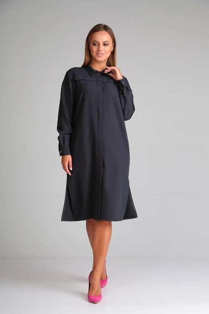 Платье-рубашка свободного кроя выполнено из костюмной ткани. По центру расположена полочка, потайная застёжка на пуговицы. Воротник рубашечного типа, сверху кокетка с отстрочной (имитацией отлетной). На спинке также выполнена кокетка, имитирующая отлетную; и бантовая складка по центру. В боковых швах расположены карманы.Рукав рубашечного типа с манжетой и застёжкой на пуговицу. В комплект входит пояс на резинке с матовой пряжкой, выполненый из той же ткани что и платье. Длина вдоль середины спинки 109 см.