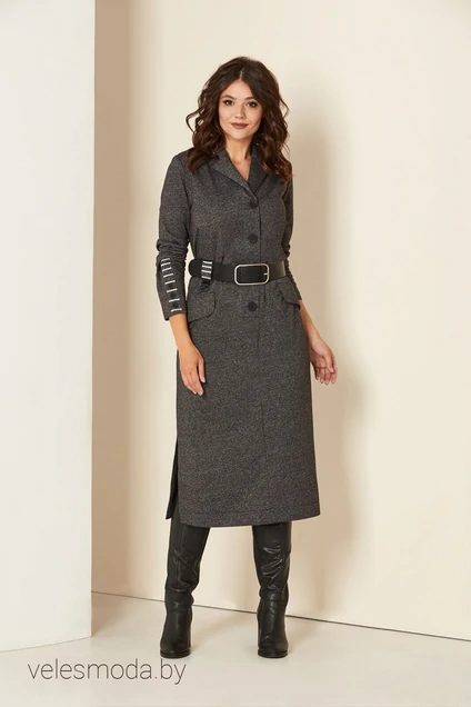 Платье женское прямого силуэта с длинным втачным рукавом, изготовлено из эластичного трикотажного полотна с меланжем. Воротник пиджачного типа, закрытая центральная застежка на петли-пуговицы. Настрочные клапаны-обманки по переду. По низу в боковых швах разрезы. Низ рукавов и шлевка для съемного готового кожаного пояса оформлены стильной вышивкой и пришивными пуговицами.