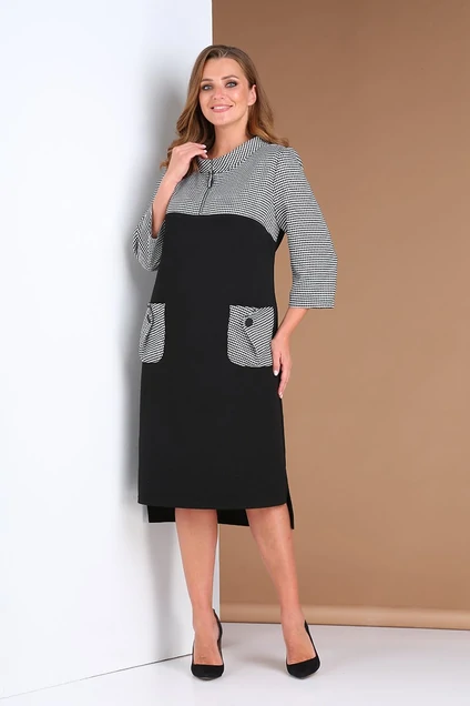 Платье женское прямого силуэта с разноуровневой линией низа. Рукав втачной длиной 3/4. Кокетка, руква, оригинальный воротник - стойка и функциональные карманы выполнены из отделочной ткани с принтом пье-де-пуль.