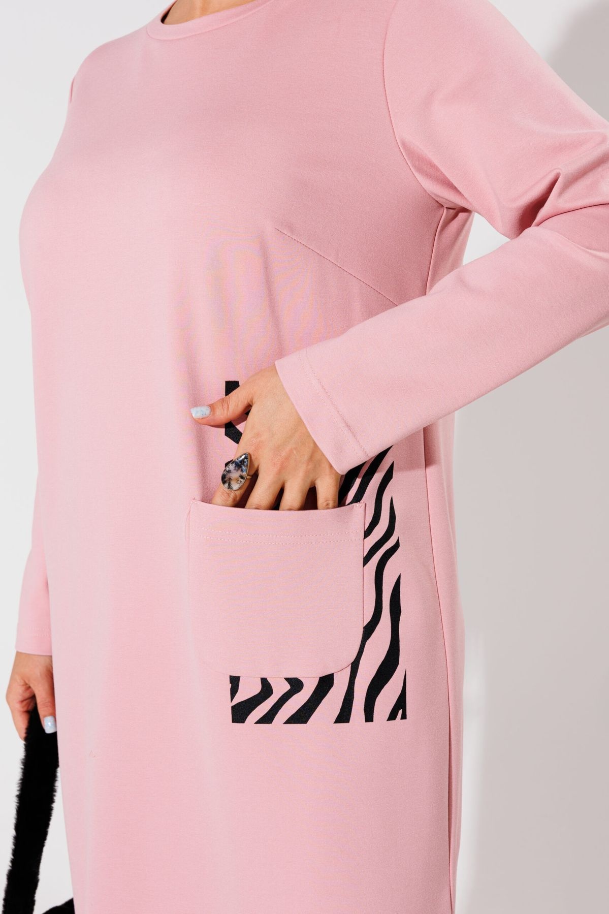 Но настоящая изюминка этого платья – это печать с принтом зебры под карманом.