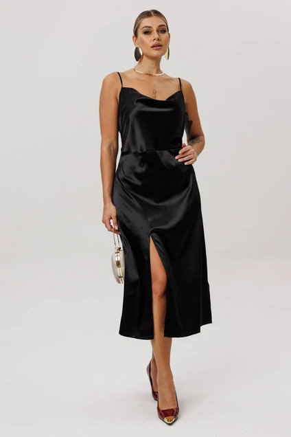 Платье актуальной во все времена длины миди с игривым разрезом изящно струится во время движения, приковывая взгляды. В правом боковом шве спрятана потайная молния. Вырез платья-качели нежно ниспадает, подчеркивая декольте и делая образ соблазнительным.