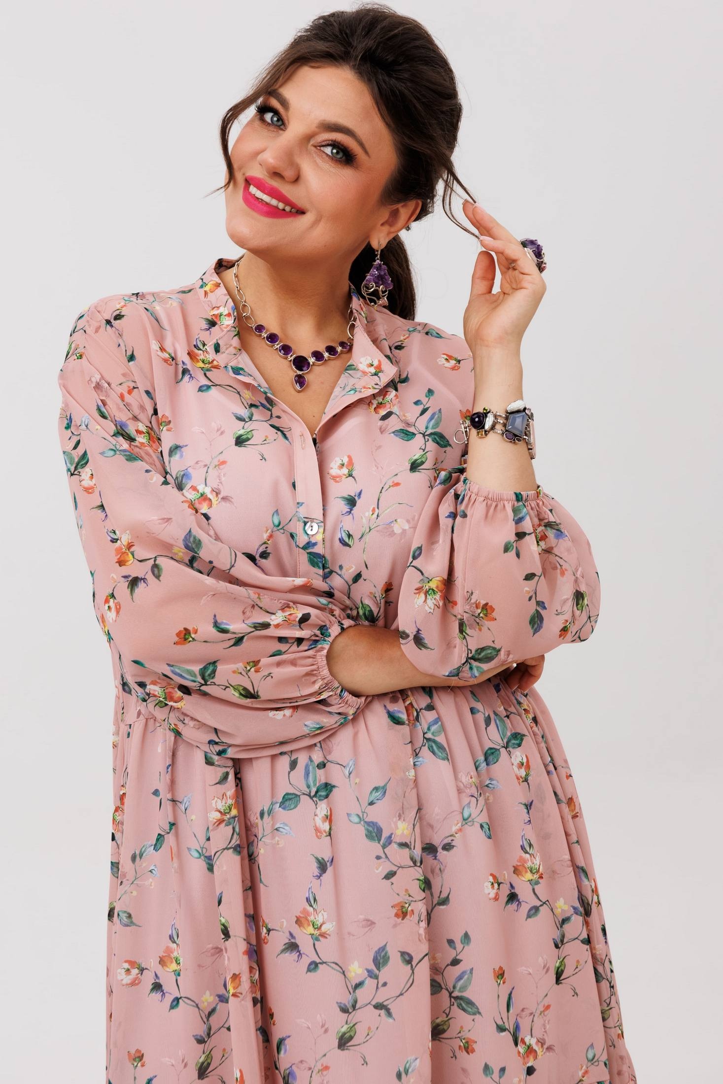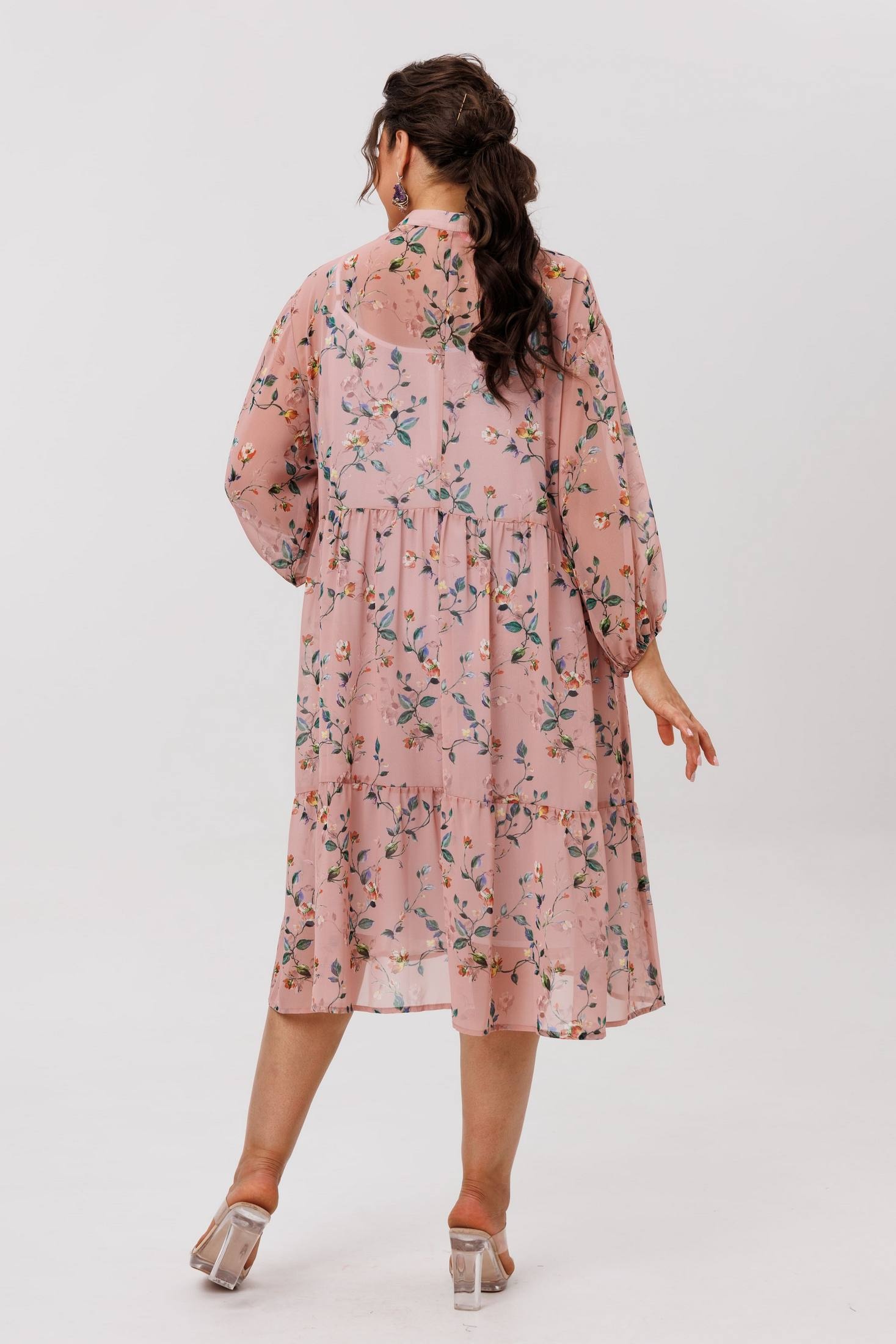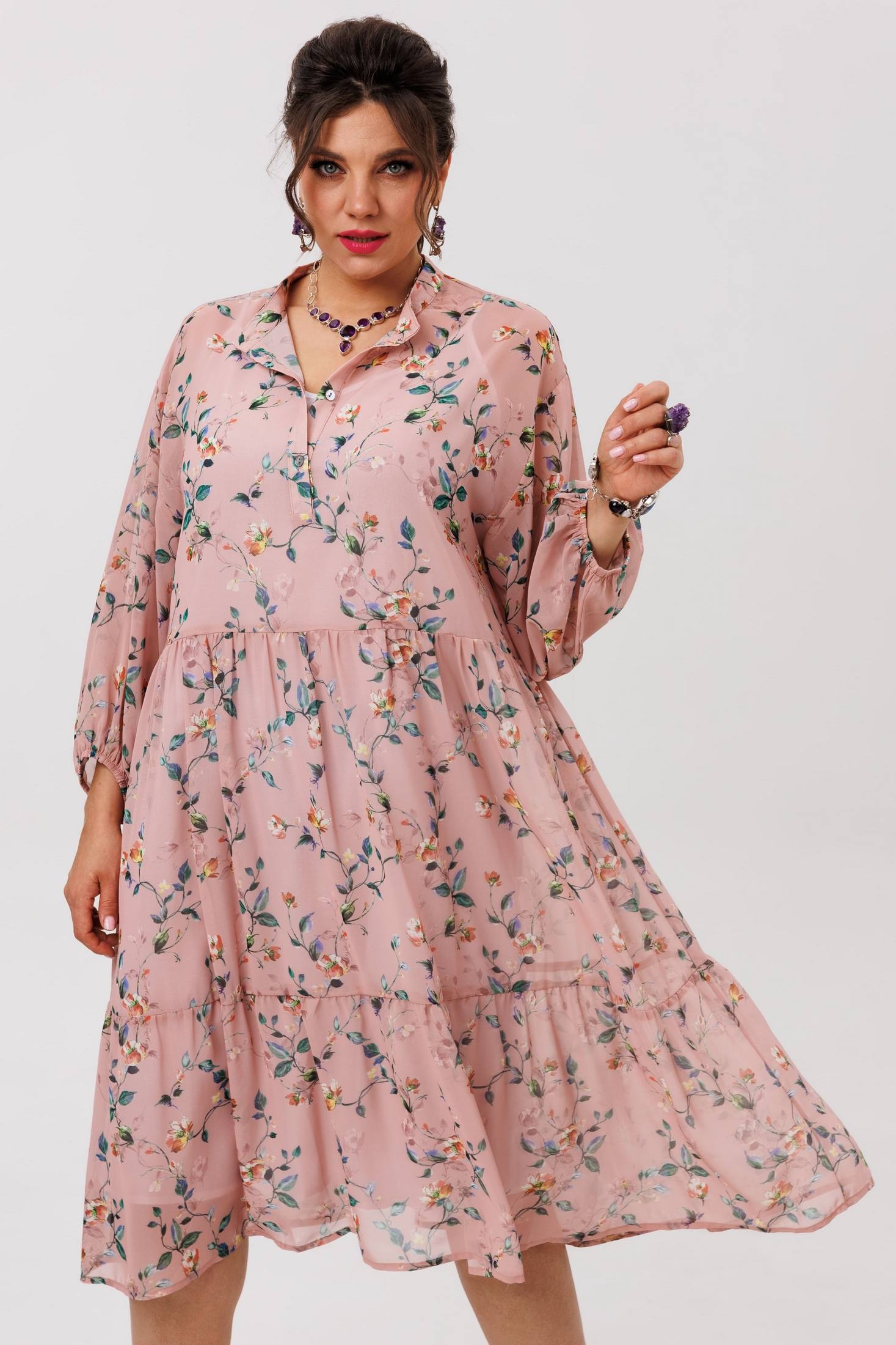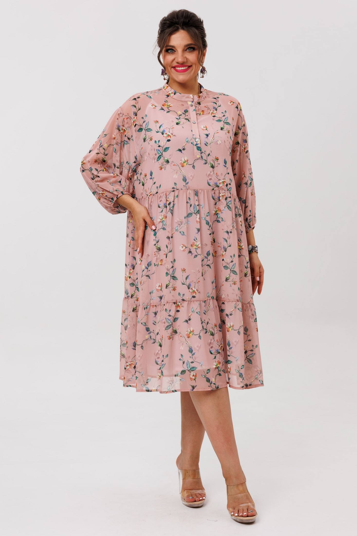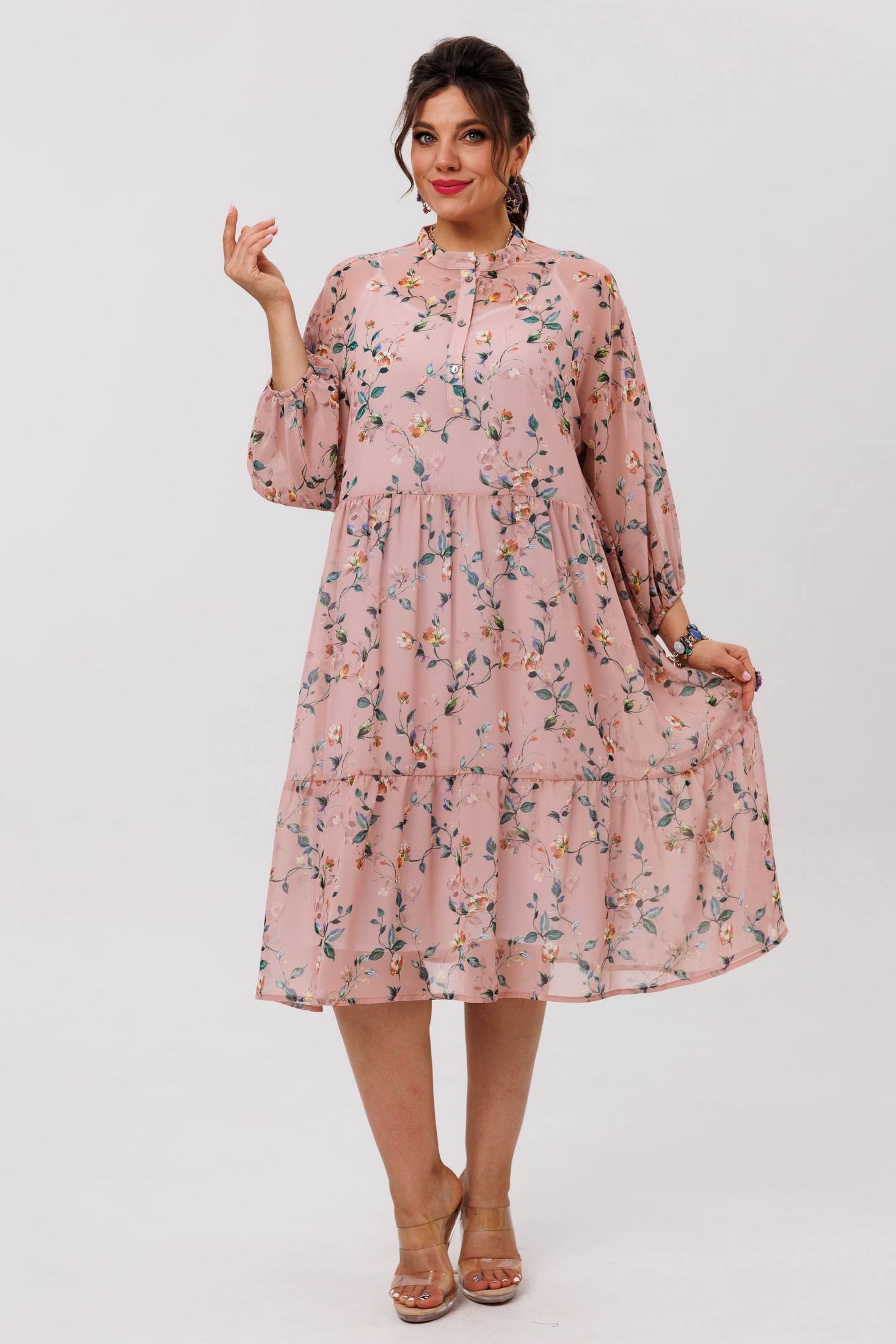 Платье 1657 пудровый сад от бренда Anelli — это лёгкий шифоновый шедевр с флористическим принтом, воплощающий атмосферу движения и свободы. Коллекция бренда Anelli предлагает свободный силуэт, который мягко струится по фигуре, даря удобство и непринуждённость. Платье с воротником-стойкой и застёжкой на пуговицы по планке подчёркивает деликатность и стильность образа. Свободные рукава на резинке создают мягкий объём и воздушность. Длина изделия по спинке составляет 110 см. Практичный чехол-комбинация на регулируемых бретелях позволяет адаптировать платье под разные ситуации, сохраняя лёгкость шифона. Платье идеально подходит для тёплого сезона, делая его универсальным выбором для повседневных и нарядных образов. Цвет пудровый с лёгкостью сочетается с любыми аксессуарами, добавляя образу нежность и романтичность.