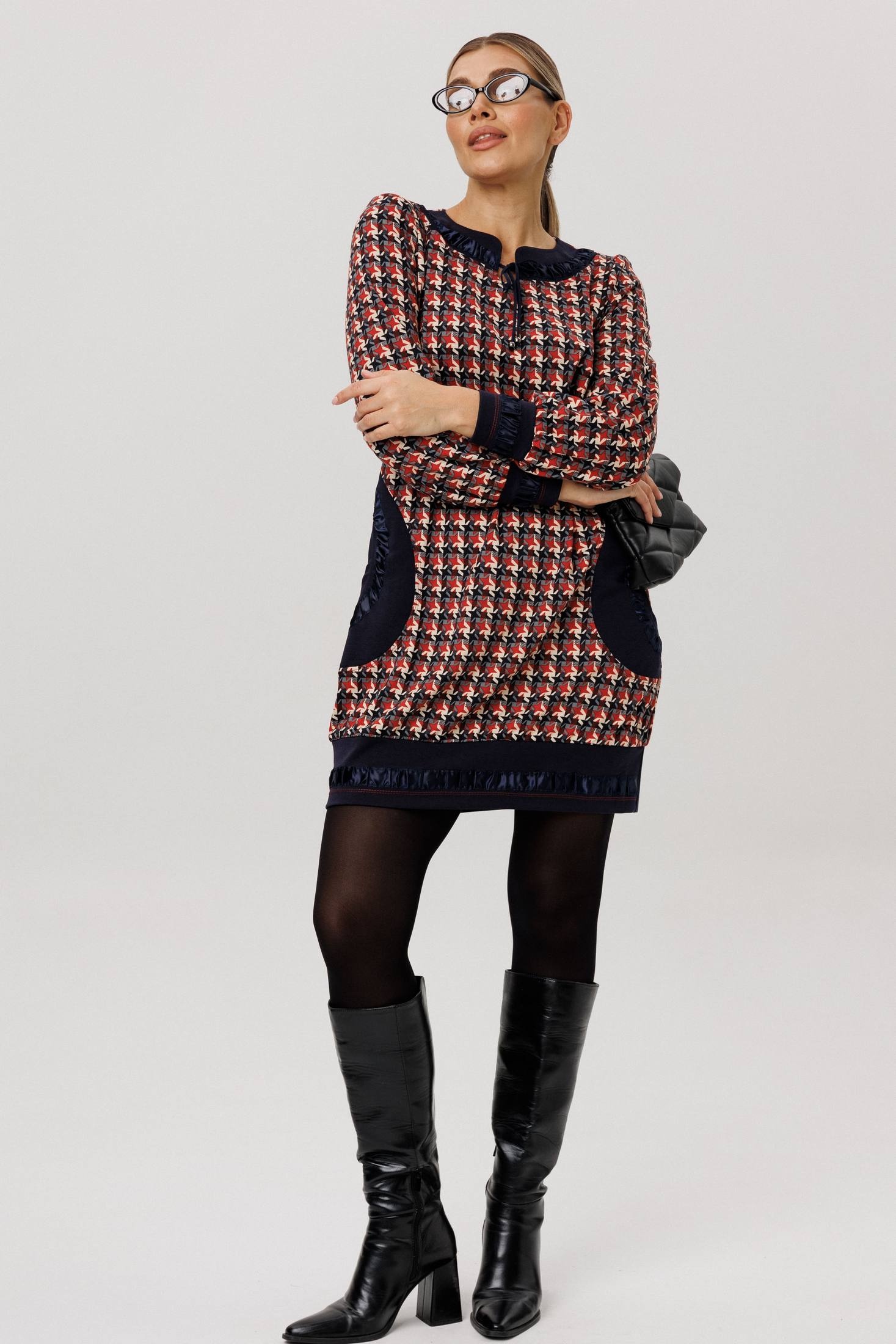 Его прилегающий силуэт, рожденный из струящегося трикотажа, мягко следует за изгибами фигуры, создавая ощущение утонченной элегантности. Классическая строгость круглого выреза горловины и длинных втачных рукавов, завершенных изящными манжетами, служит идеальным фоном для трогательного акцента — нежной завязки-капельки, украшенной переливом атласной ленты. Эту лиричную ноту мастерски уравновешивают практичные элементы: два аккуратных накладных кармана и четкий манжет по низу, которые придают силуэту завершенность и структуру.