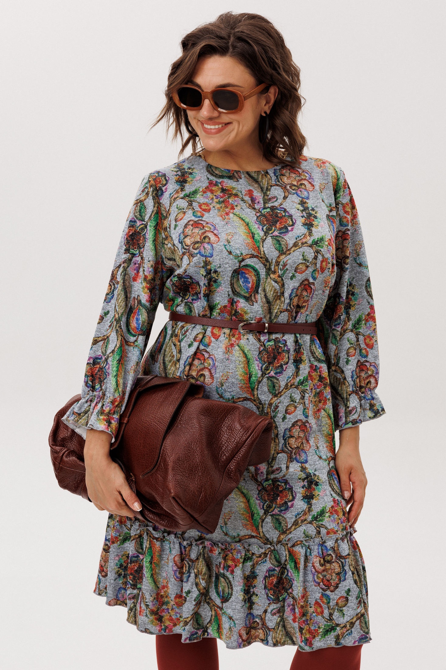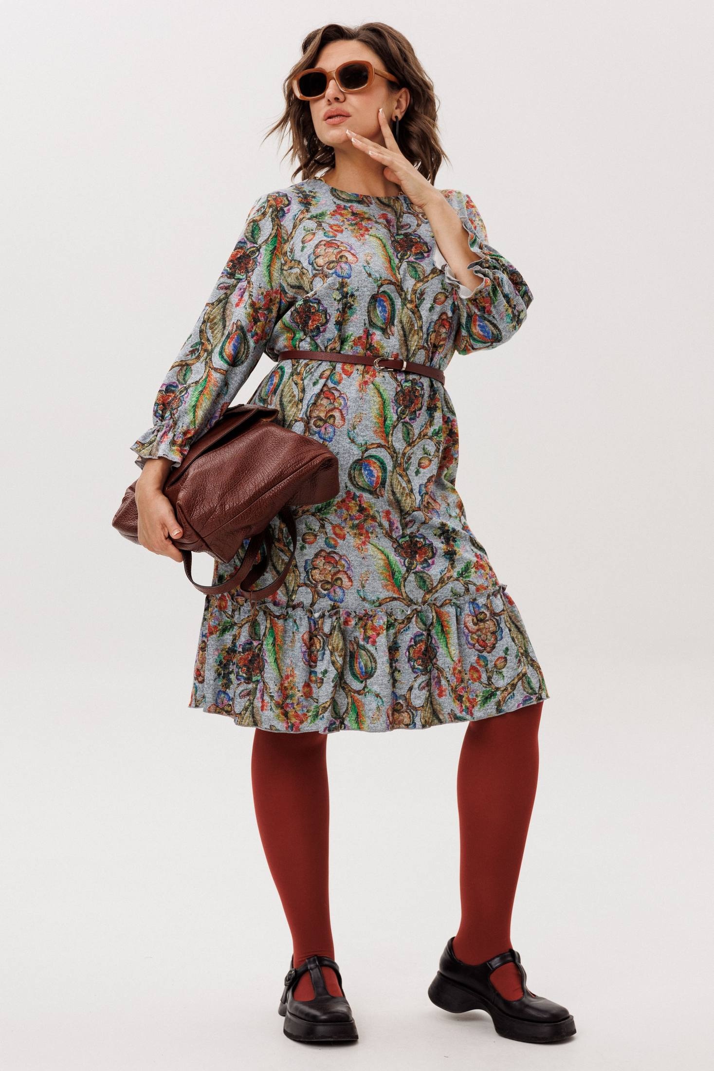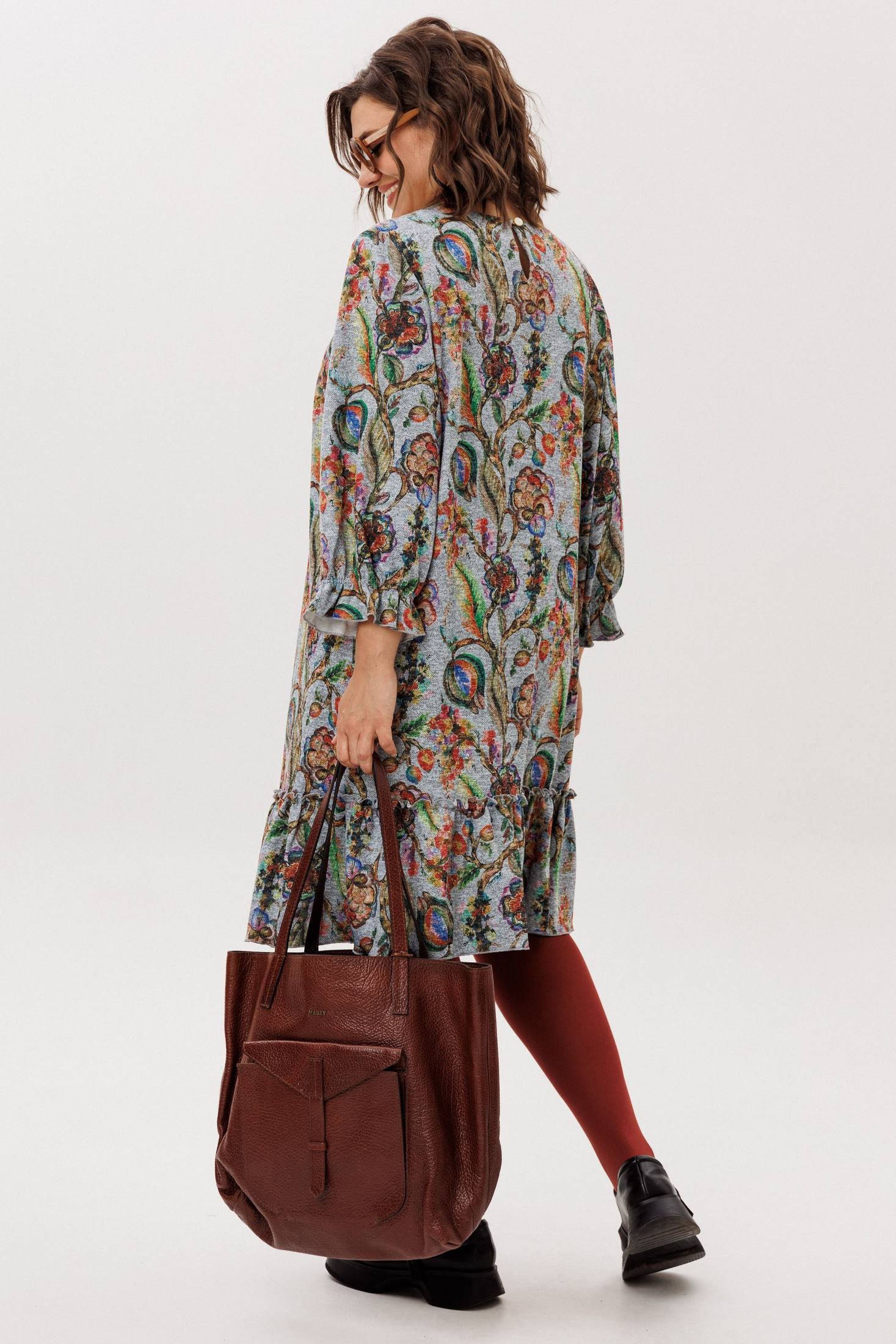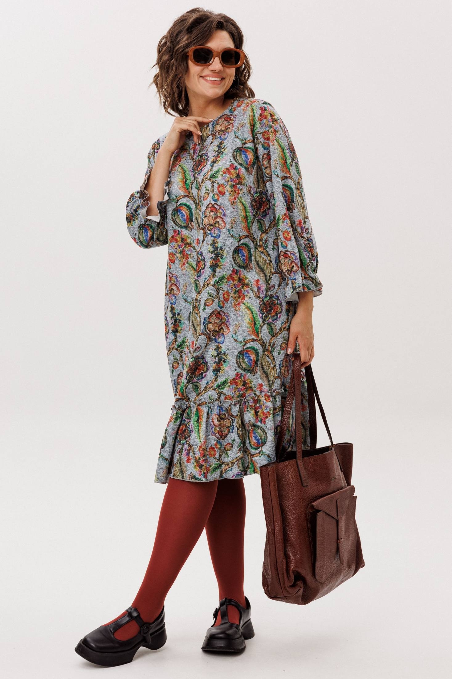 Трикотажное платье прямого кроя, украшенное ярким акварельным принтом, гарантированно станет центром внимания. Укороченные рукава, собранные на резинке, сочетают практичность с изящным акцентом на запястье. Круглый вырез горловины мягко обрамляет шею, а низ платья, оформленный притачным воланом, придает всему образу летящую, воздушную легкость.