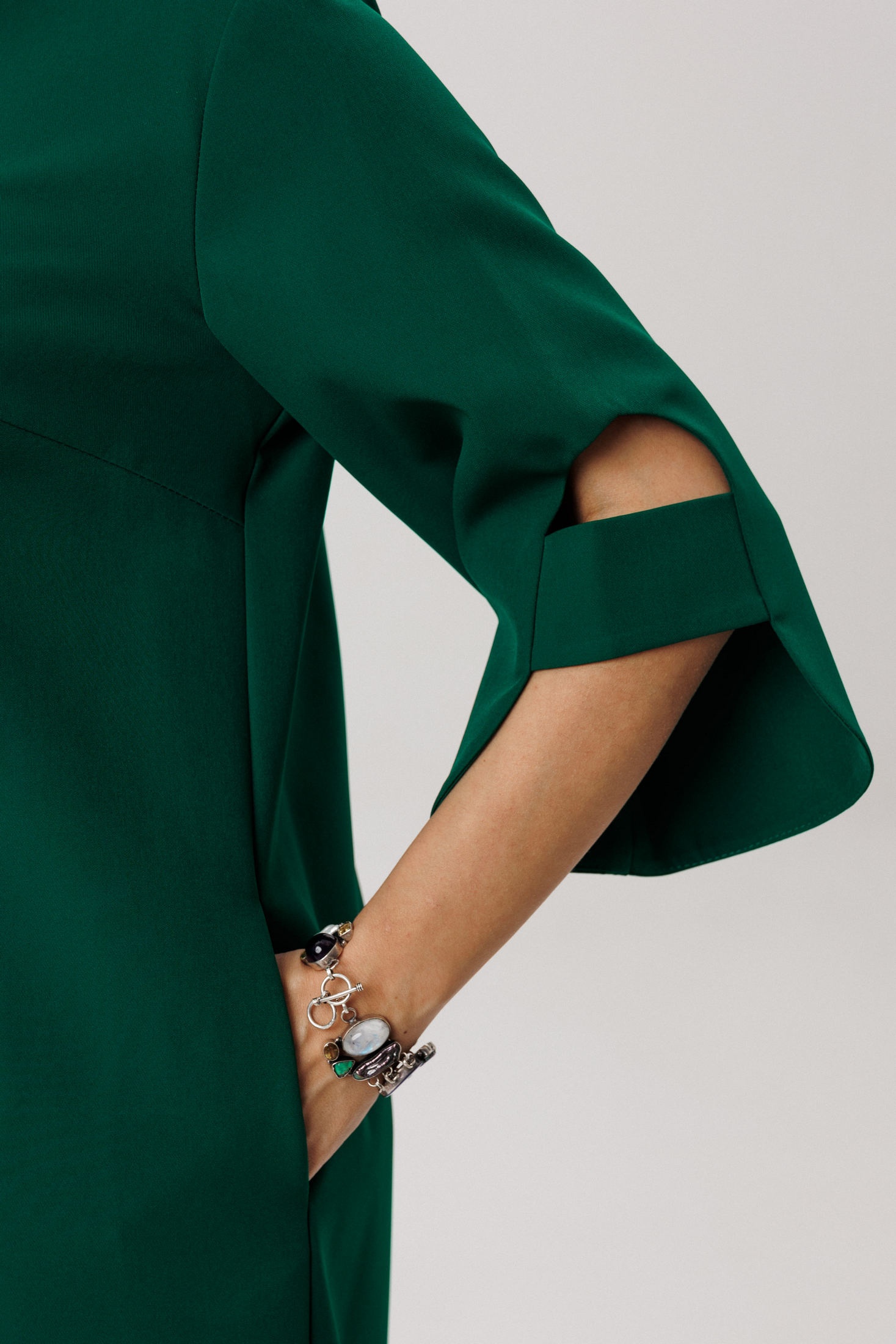 Его подлинной жемчужиной является рукав с фигурным низом и изящной перемычкой - архитектурный элемент, придающий силуэту воздушный объем и скульптурную выразительность. Практичность встречает утонченность в боковых карманах, скрытых в швах.