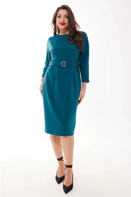 Платье полуприлегающего силуэта с рукавом летучая мышь. Спика платья состоит из двух деталей, со средним швом, в котором обработана застежка на петли-пуговицы. Средний шов спинки заканчивается шлицей. Горловина круглая. Дополнением служит пояс с декоративной пряжкой.