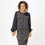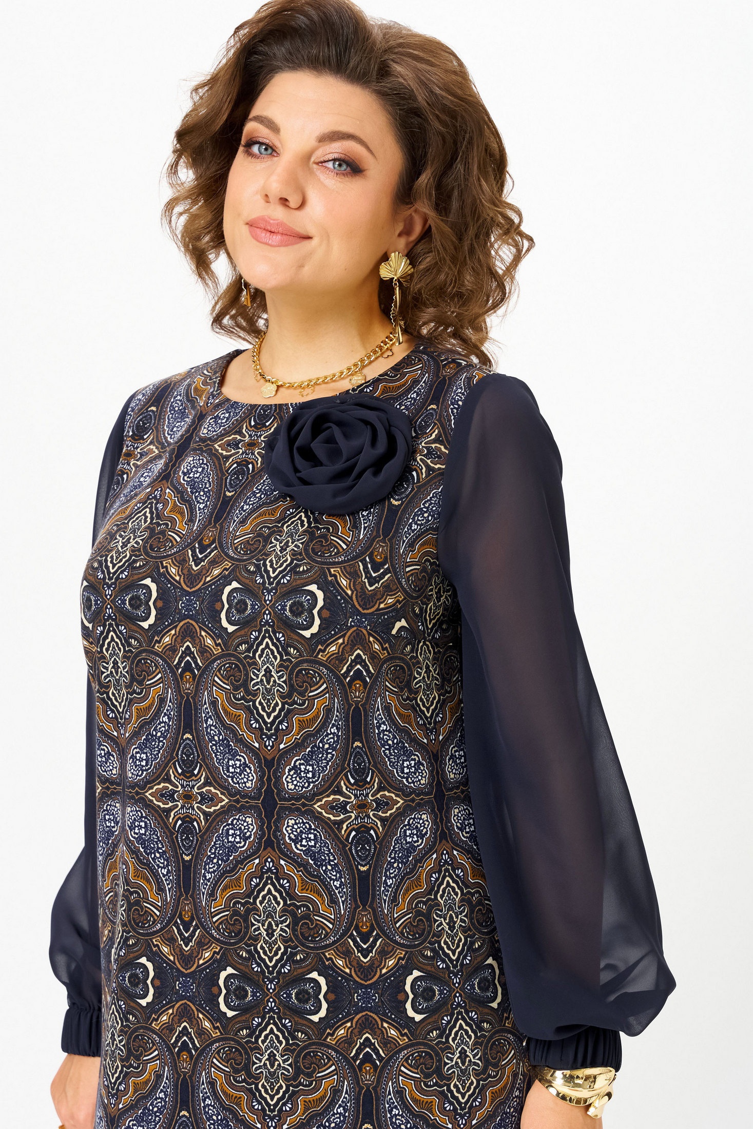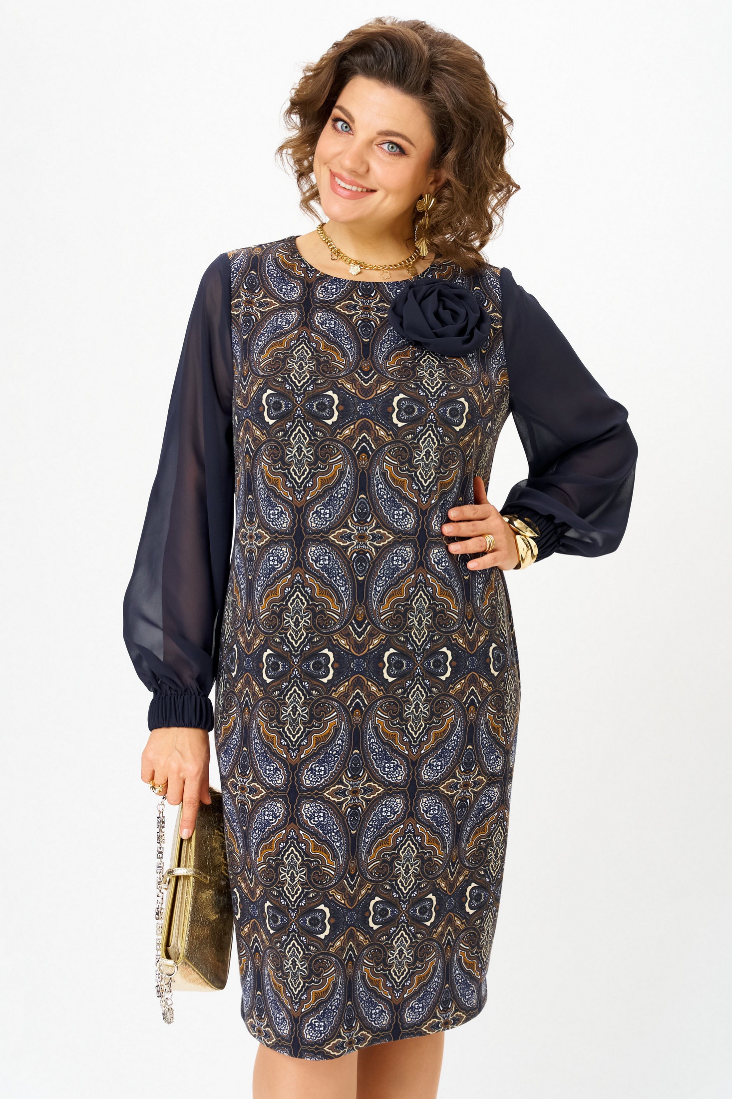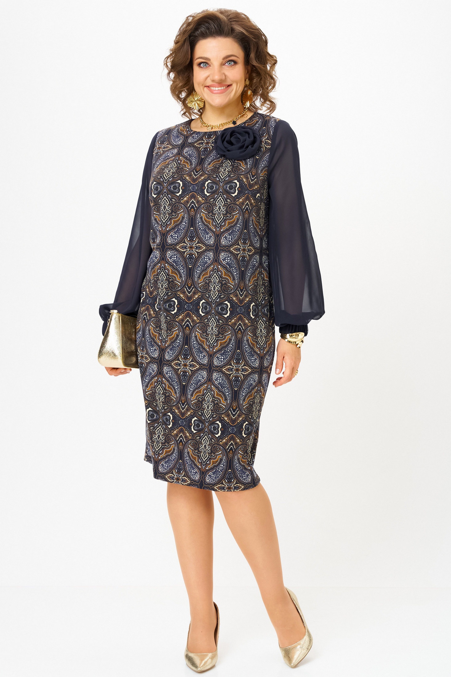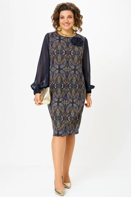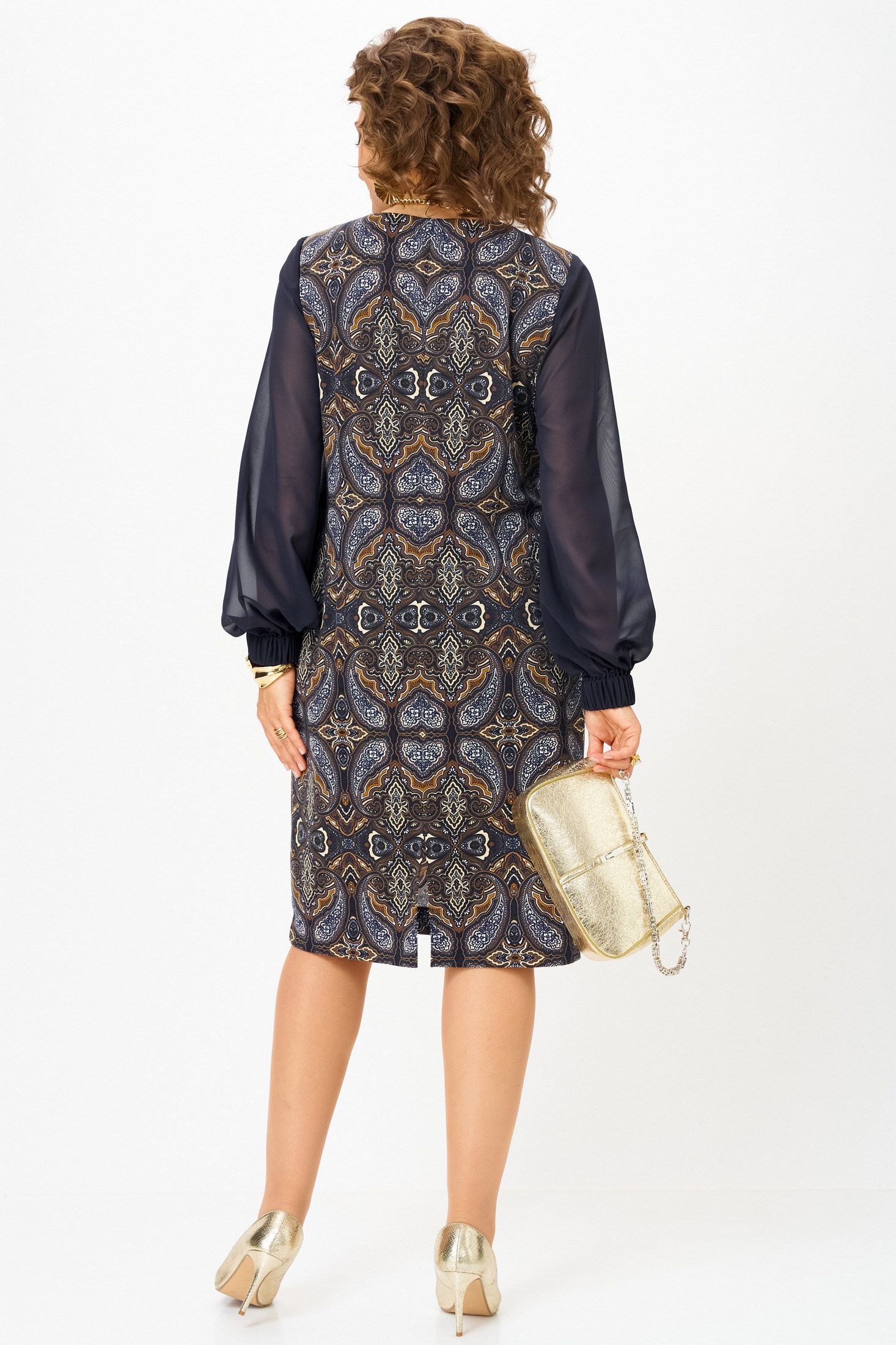 Платье полуприлегающего силуэта с округлой горловиной. Перед с нагрудными вытачками. Спинка с талиевыми вытачками, застежкой молнией и разрезом в среднем шве. Рукав втачной прямой длинный, на резинке по низу.