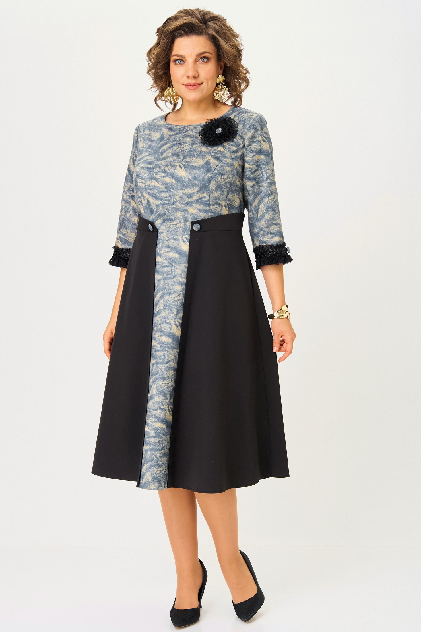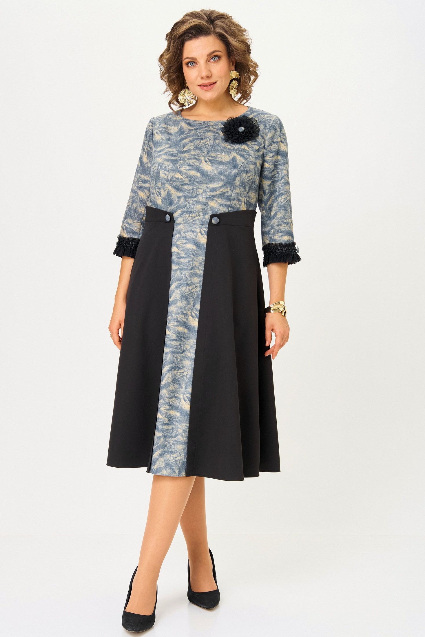 Платье полуприлегающего силуэта, отрезное по линии талии. Горловина округлой формы, обработана обтачкой. По переду лифа — рельефные швы. По спинке лифа талиевые вытачки и средний шов, в котором обработана потайная молния. Юбка платья "клеш", с вертикальной вставкой по переду и средним швом по спинке. Подрез по талии закрывается декоративным поясом с пуговицами. Добавят комфорта при носке функциональные карманы в боковых швах. Рукав втачной прямой, длиной ¾, по низу — манжет, декорированный тесьмой и пуговицей. В комплекте к платью прилагается съемное украшение из тесьмы.Длина платья: 118 см. Длина рукава: 43 см