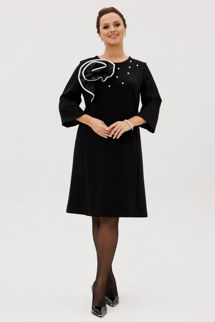 Изысканное черное платье трикотажное, выполненное в прямом силуэте, станет отличным дополнением к вашему гардеробу. Элегантный круглый вырез горловины и рукава 3/4 рубашечного покроя (47 см) подчеркивают женственность образа, а потайная молния на спинке обеспечивает идеальную посадку. Длина платья составляет 97 см. Нежный контрастный декор в виде аппликации и точечных элементов на передней части платья добавляет изюминку этой модели. Высокое качество материала обещает комфорт и долговечность. Эта модель идеально подходит для роста 170 см, обеспечивая изящество и стиль в любой ситуации.