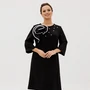 Элегантное черное платье из костюмной ткани длиной до середины икры. Приталенный силуэт этого платья подчеркивает фигуру, создавая изысканный образ. Особенностью дизайна является имитация рубашки из прозрачного черного шифона, видимая на рукавах и воротнике. Платье оснащено широкими бретелями, что добавляет комфорта при носке. Передняя часть украшена рядом декоративных золотистых пуговиц, которые привносят в образ нотку роскоши. Длина платья составляет 112 см, что идеально подходит для постройки роскошного вечернего образа. Длина рукава включает широкий манжет, составляя 63 см. Это платье станет изысканным выбором для важных мероприятий и деловых встреч.