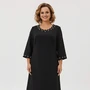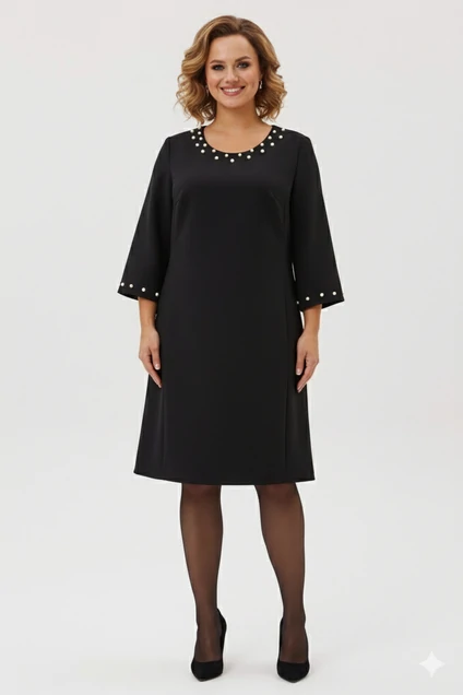Элегантное черное платье прямого силуэта. Изготовлено из качественной костюмной ткани, платье обеспечивает комфорт и умеренный объем. Длиной до колена (97 см) и рукавами 3/4 длиной 47 см, данная модель подчеркивает изящество фигуры. Рукава оформлены изысканными золотистыми кнопками на манжетах, добавляя блеск и изысканность. Округлый вырез горловины и потайная молния на спинке обеспечивают безупречный вид и удобство при надевании. Платье идеально подходит для создания стильного и сдержанного образа.