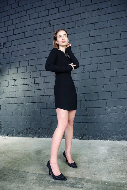 Короткое чёрное платье с длинным рукавом выполнено из мягкого эластичного трикотажа, который приятен телу. Благодаря облегающему силуэту платье выгодно подчёркивает женственность и стройность фигуры. Закругленные края низа образуют аккуратные разрезы на бедре, удлиняя ноги