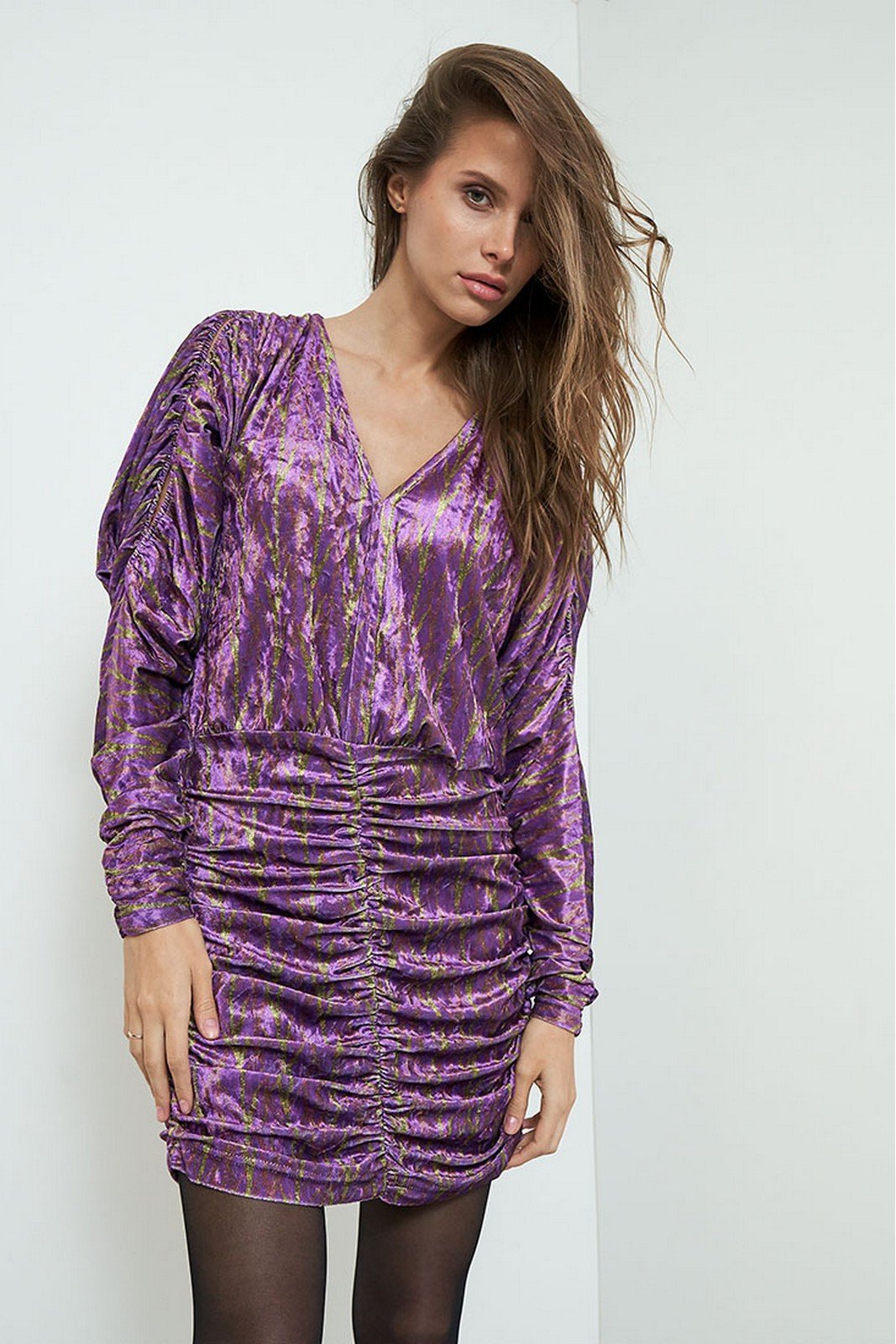 Это маленькое короткое нарядное платье, оформленное в ярких оттенках фиолетового и золотистого цветов, будет идеальным выбором для праздничного вечера. Выразительный дизайнерский принт, создающий динамичные волнообразные линии по всему изделию, эффектно подчеркивает силуэт. Платье с длинными рукавами и V-образной горловиной элегантно акцентирует зону декольте, придавая образу особую изысканность. Обратите внимание на возможное отличие оттенков фотографии из-за разной цветопередачи мониторов.