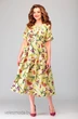 Платье женское полуприлегающего силуэта, расширенное к низу. Выполнено из тонкого непрозрачного стрейчевого шифона. Горловина фигурная. Рукав короткий, с рюшей в фигурном подрезе по низу. Платье отрезное по талии. Лиф платья с центральным швом и планкой на пуговицах. Из-под планки рюша с обеих сторон. Нагрудная вытачка из бокового шва, талиевая от линии талии. Спинка без вытачек. Юбка платья состоит из трёх ярусов воланов разной высоты. Застёжка-молния в боковом шве.