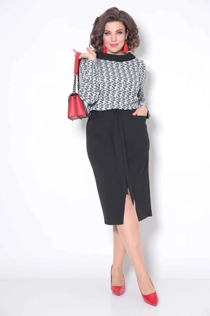 Платье женское , полуприлегающего силуэта из трикотажного полотна двух видов. Рукав длинный. Горловина с воротником на цельнокроенной стойке. Платье отрезное ниже линии талии. Лиф с нагрудными вытачками. Перед юбки с фигурными рельефами, карманами, внизу разрез. Спинка со шлицей и застежкой-молнией в среднем шве. Пояс платья продет через шлевки, расположенные ниже линии талии.