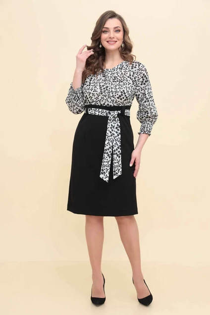 Платье женское, полуприлегающего силуэта из плательной стрейчевой ткани и шифона. Горловина круглая, на планке. По переду из-под планки сборка. Рукав покроя реглан, три четверти, к низу расширен. По низу рукава сборка на несколько рядов резинки. Платье отрезное с завышенной линией талии. По линии талии расположен пояс, который крепится шлёвками. Юбка платья по переду с талиевыми вытачками, по спинке вытачки и шлица. Застёжка на тесьму-молнию в среднем шве спинки.