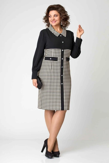 Платье женское полуприлегающего силуэта, выполнено из трикотажа и плательной ткани в клетку. Горловина V-образной формы с отложным воротником. Рукав длинный, расширен к низу и присборен на манжет. Высокий манжет на застёжку, на три пуговицы. Перед с планкой до низа, с имитацией застёжки. Лиф отрезной с нагрудными вытачками. Низ платья с талиевыми вытачками, карманы с листочкой ниже уровня талии. Спинка с центральным швом. Верх отрезной. Застёжка на тесьму-молнию вверху, по низу шлица.