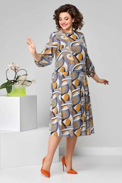 Платье женское свободного силуэта, выполнено из шифона на трикотажной подкладке. Горловина округлая, рукав 3/4, расширенный к низу на резинку. Платье двухслойное, имитирующее блузку и юбку. Отложной верх на подкладке, по переду нагрудные вытачки, по спинке вверху застёжка на капельку с петлёй и пуговицей. Юбка платья притачана к подкладке, по переду и заднему полотнищу складки. Юбка расширена к низу.