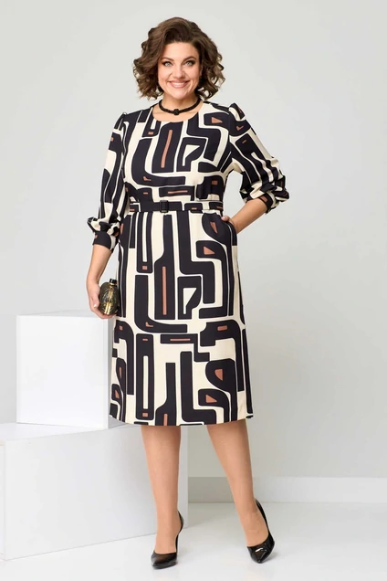Платье женское свободного силуэта нарядно-повседневное из плательной ткани. Горловина округлая, рукав три четверти, сборка по окату, по низу расширение на манжет с пуговицей. Перед с нагрудными вытачками и боковой асимметричной шлицей. Спинка свободная. К платью прилагается пояс с пряжкой. Карманы в боковых швах.