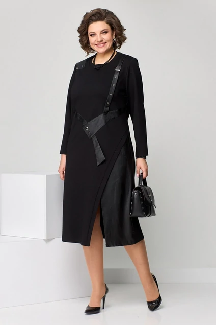 Платье женское нарядно-повседневное полуприлегающего силуэта из трикотажа с кожаными вставками. Горловина округлая, рукав длинный. Перед с нагрудными выточками и асимметричным подрезом с планкой. Из-под планки деталь из экокожи с разрезом. С правой стороны асимметричная деталь из плечевого шва с блочками. В области талии асимметричная имитация пояса с блочками. Спинка свободная.