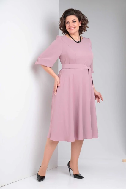 Платье женское полуприлегающего силуэта из плательной ткани. Горловина округлая, рукав три четверти, расширен к низу на резинку и присборен по окату. Платье отрезное по талии. Перед с рельефами их проймы, спинка с вытачками из горловины и по талии. Юбка платья покроя "клеш". К платью прилагается пояс на завязку.