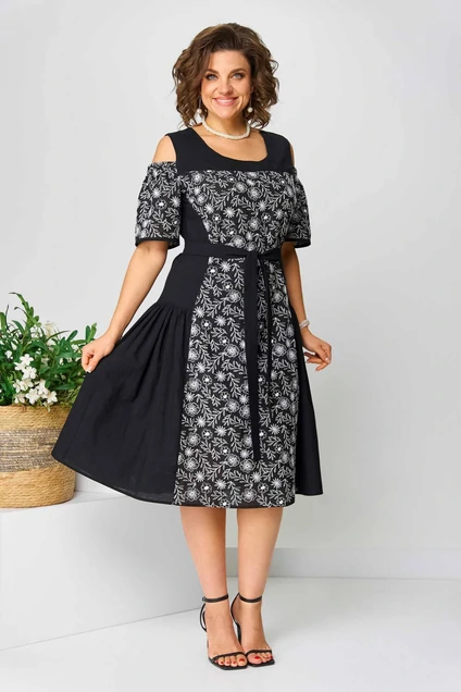 Платье женское летнее, полуприлегающего силуэта из хлопковой ткани двух видов. Горловина округлая. Рукав на полпроймы. Вверху на резинке, низ с окантовкой. Перед с кокеткой. Из проймы рельефы до низа. Ниже уровня бедер воланы по переду и спинке. Вверху спинки кокетка. Платье без застежки. Длина изделия 111 (±2) см.