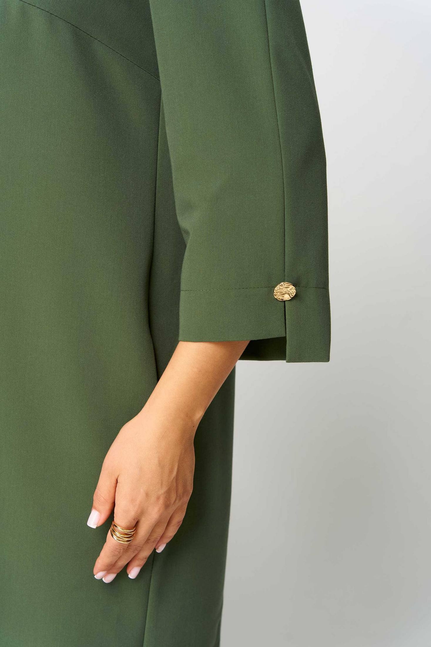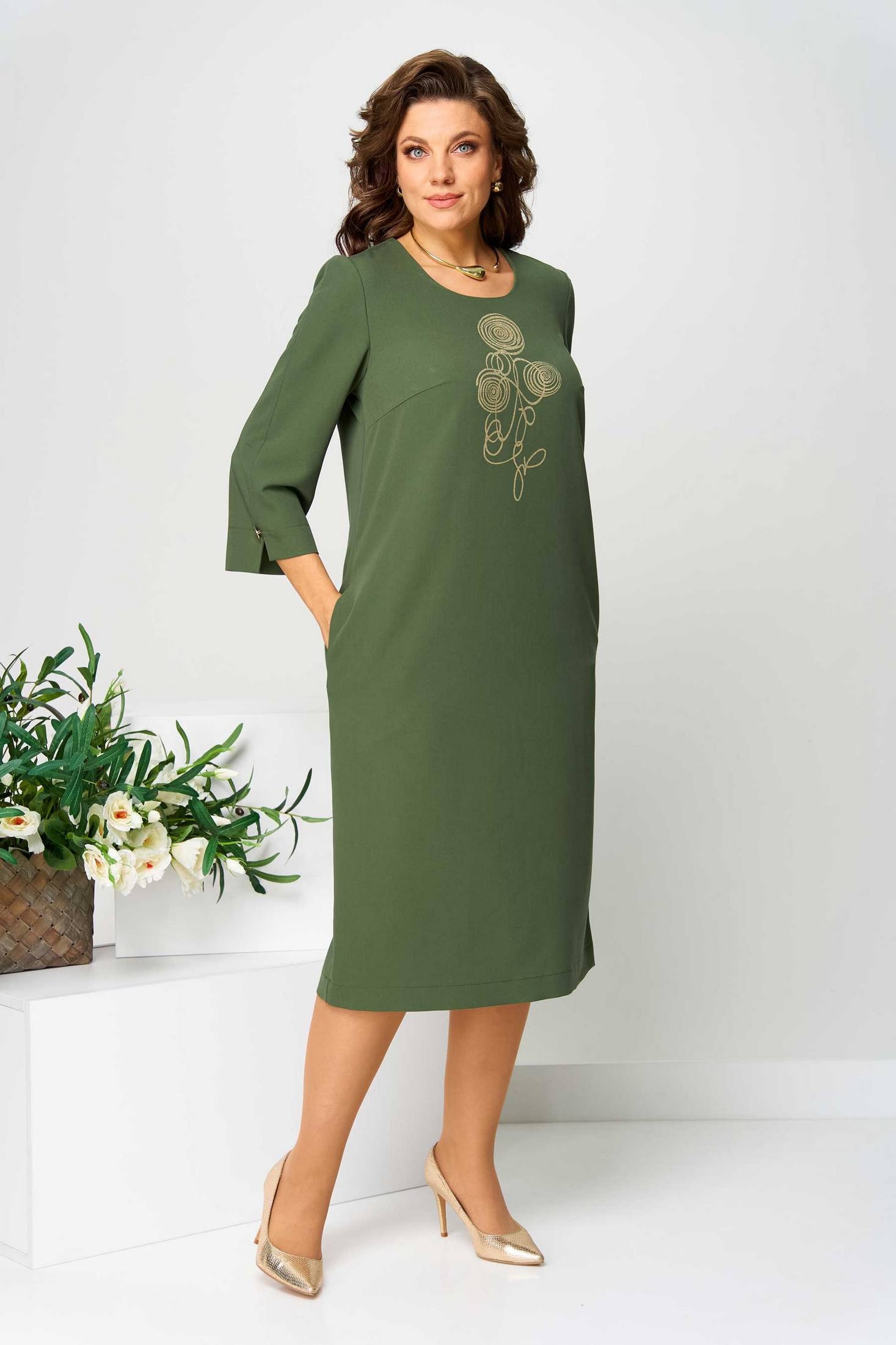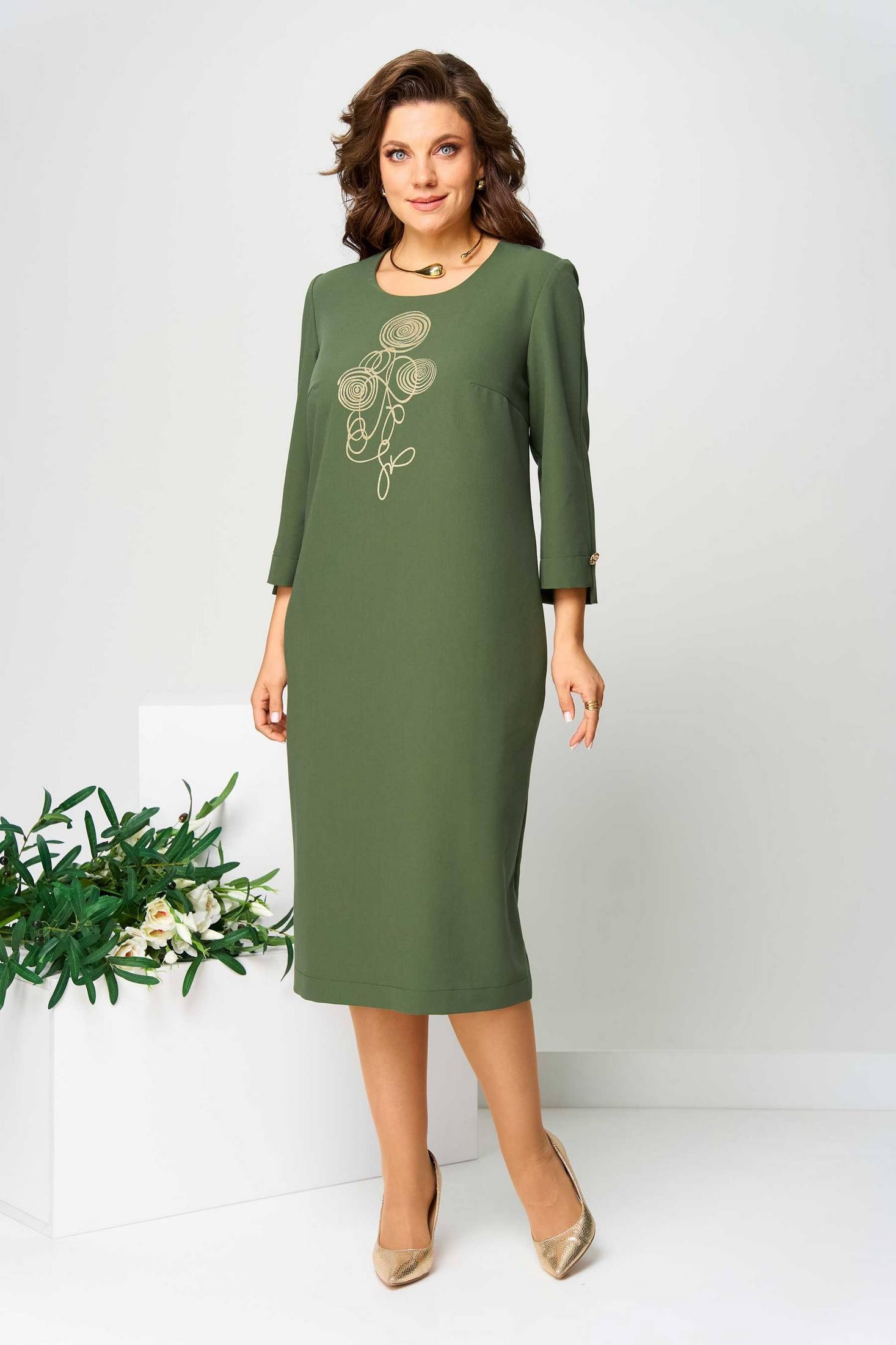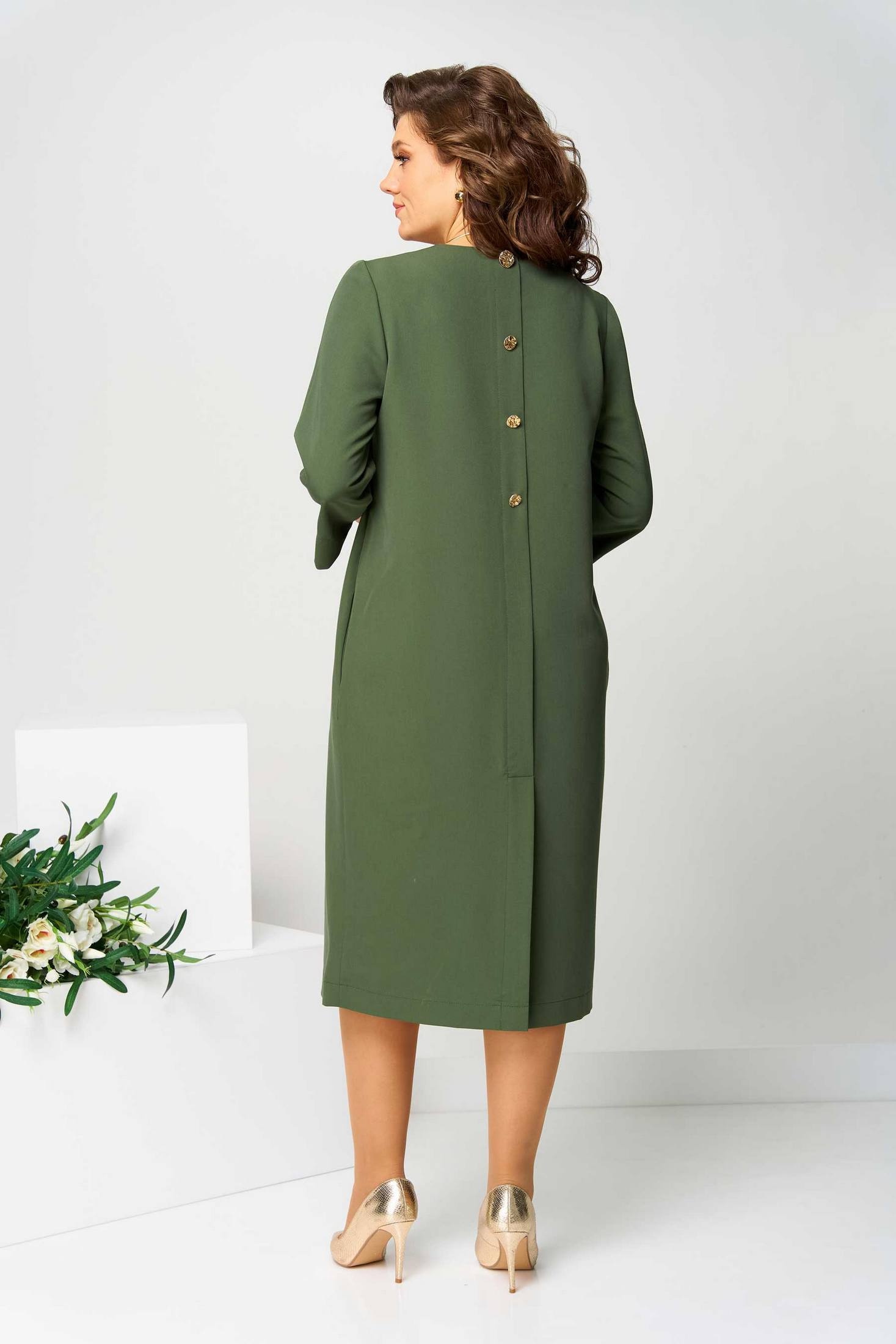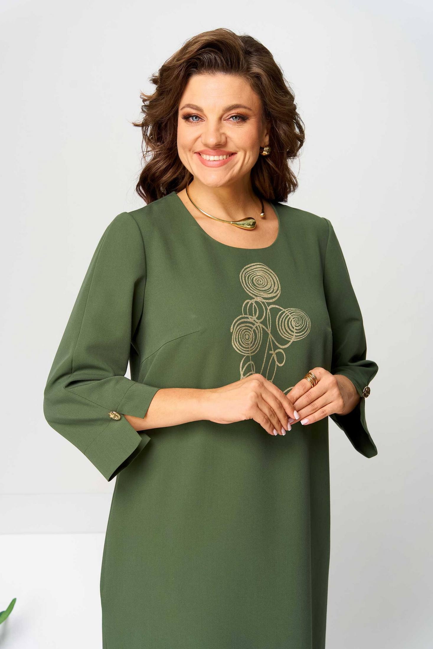 Платье женское полуприлегающего силуэта. Вырез горловины округлый. Платье украшено по переду печатью, на спинке планкой с декоративными пуговицами и шлицей. В боковых швах карманы. Рукав втачной, длиной ¾, по низу разрез, украшенный пуговицей. Объём груди размер 50 – 106 (±2) см, размер 52 – 110 (±2) см, размер 54 – 114 (±2) см. Объём талии, размер 50 – 108 (±2) см, размер 52 – 112 (±2) см, размер 54 – 116 (±2) см. Объём бёдер: размер 50 – 116 (±2) см, размер 52 – 120 (±2) см, размер 54 – 124 (±2) см.