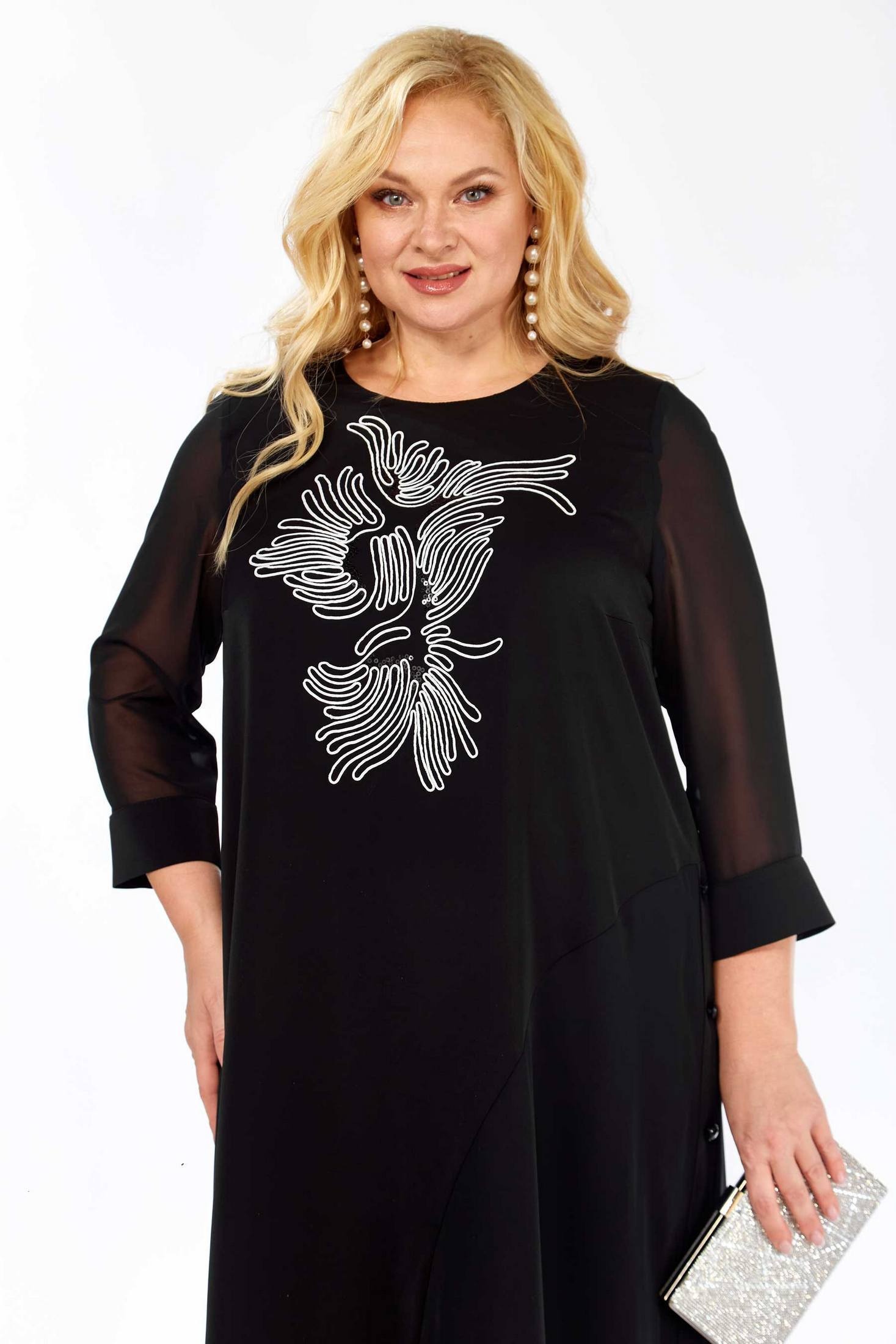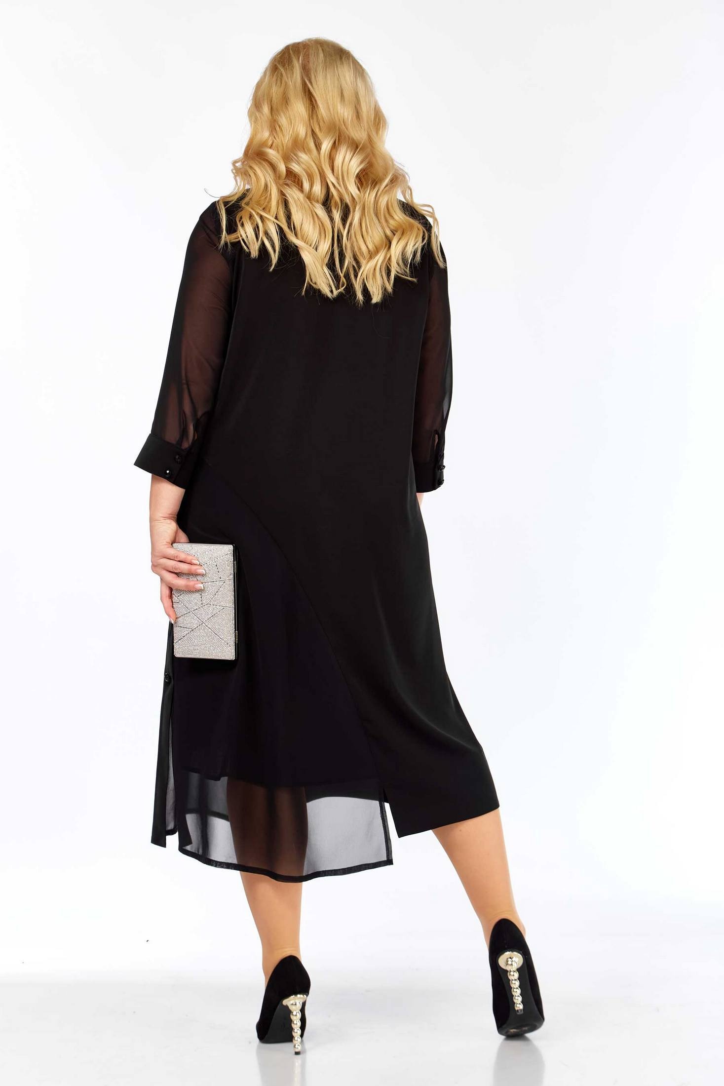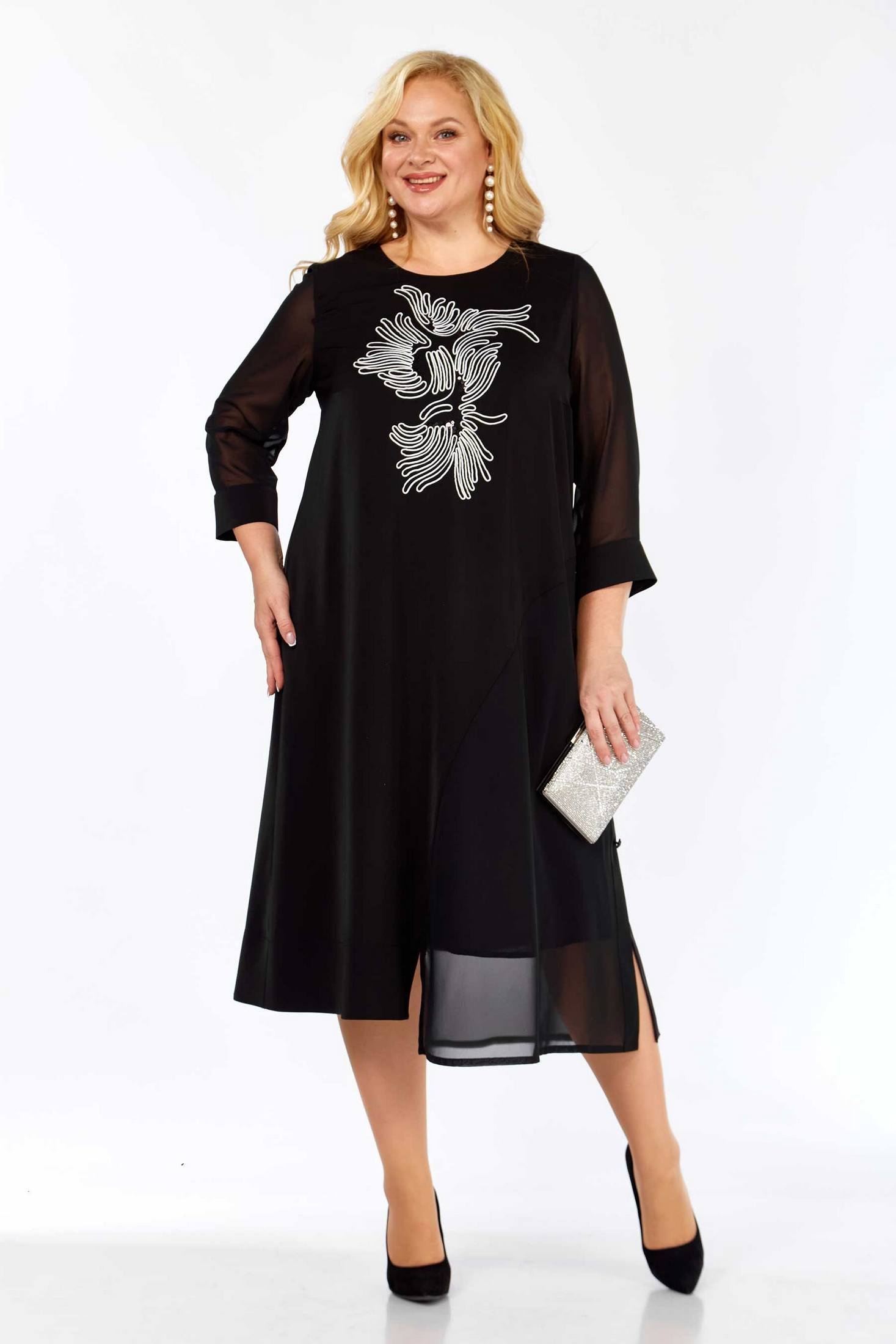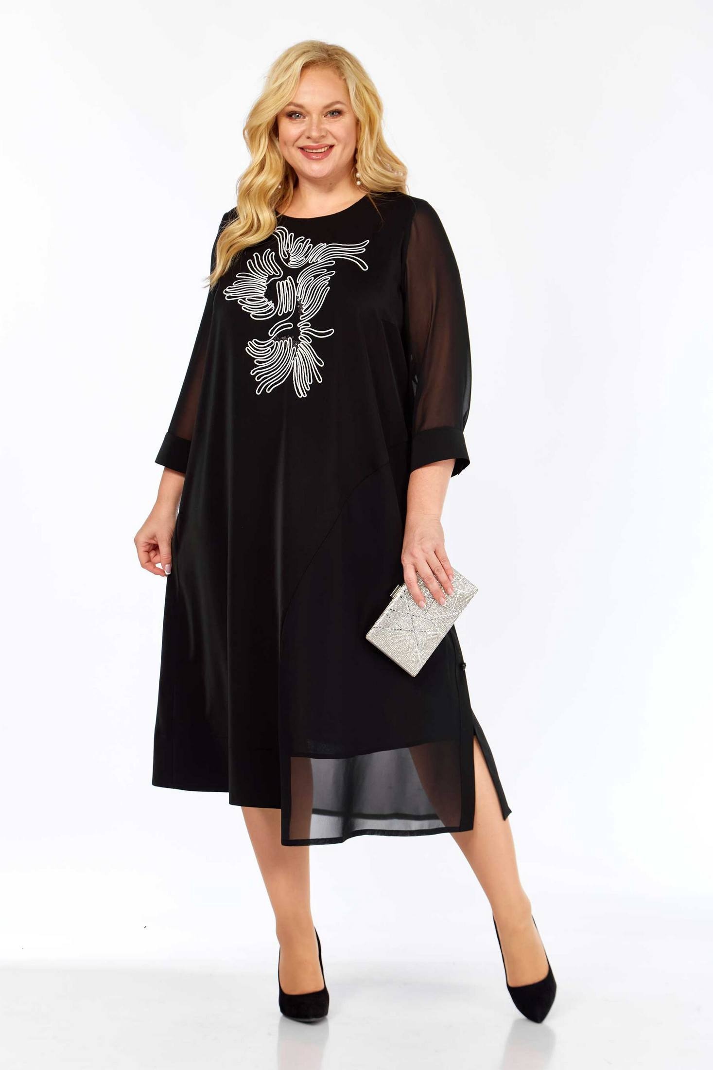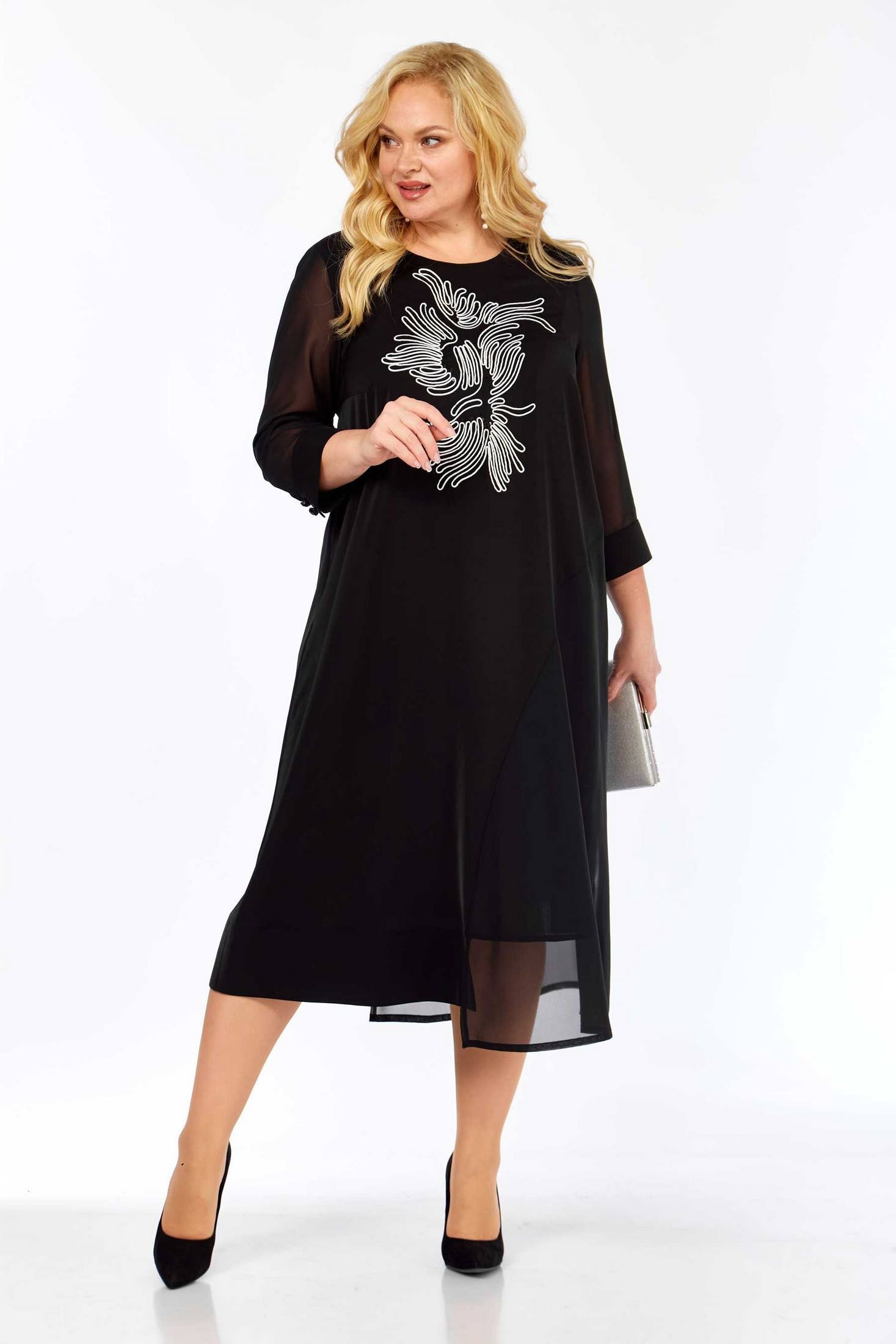 Платье женское полуприлегающего силуэта. По переду и спинке платья кокетки. От центра переда и спинки к левому боковому шву выполнен подрез с декоративной планкой. Платье украшено вышивкой. Рукав втачной, по низу на манжете. Объём груди
