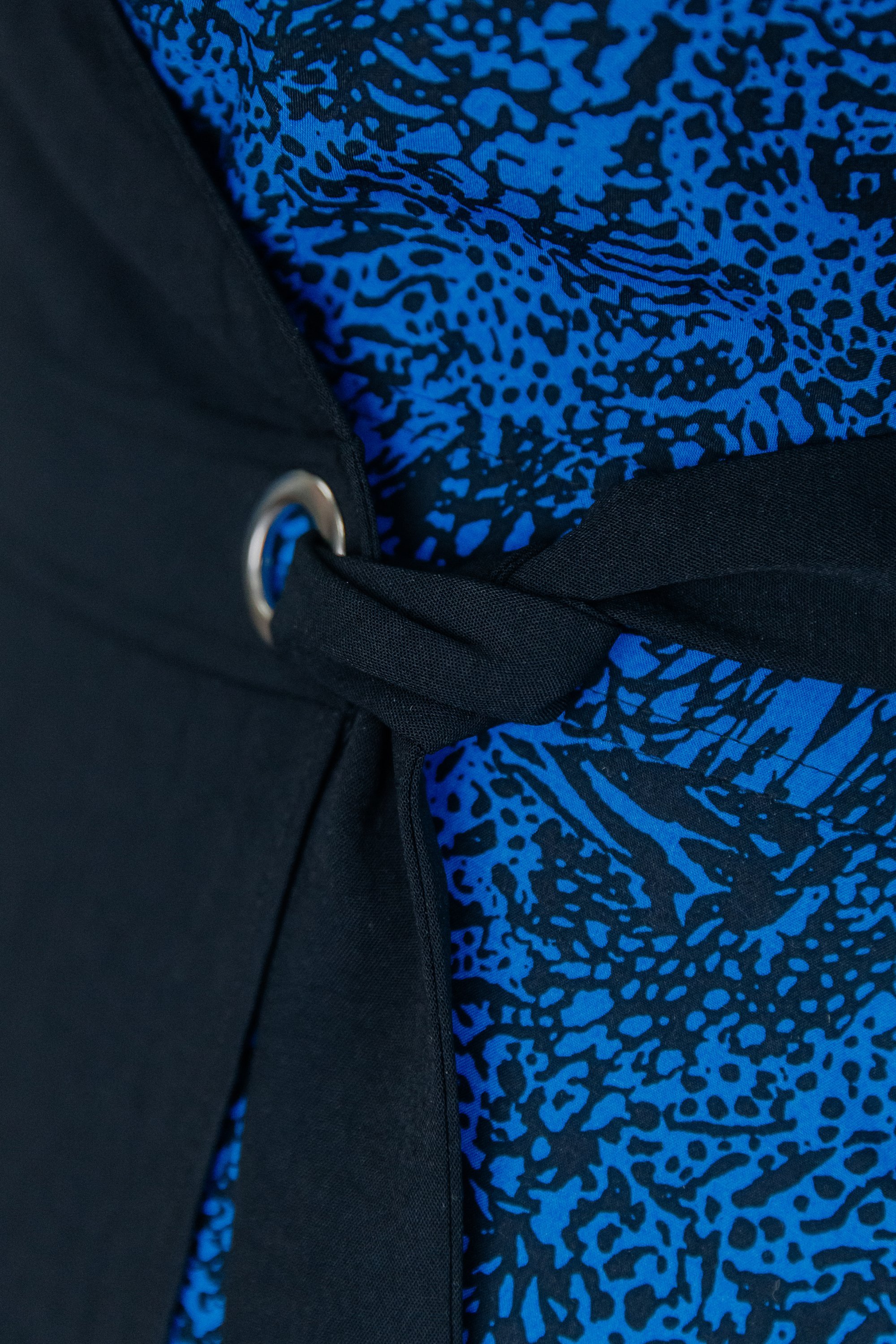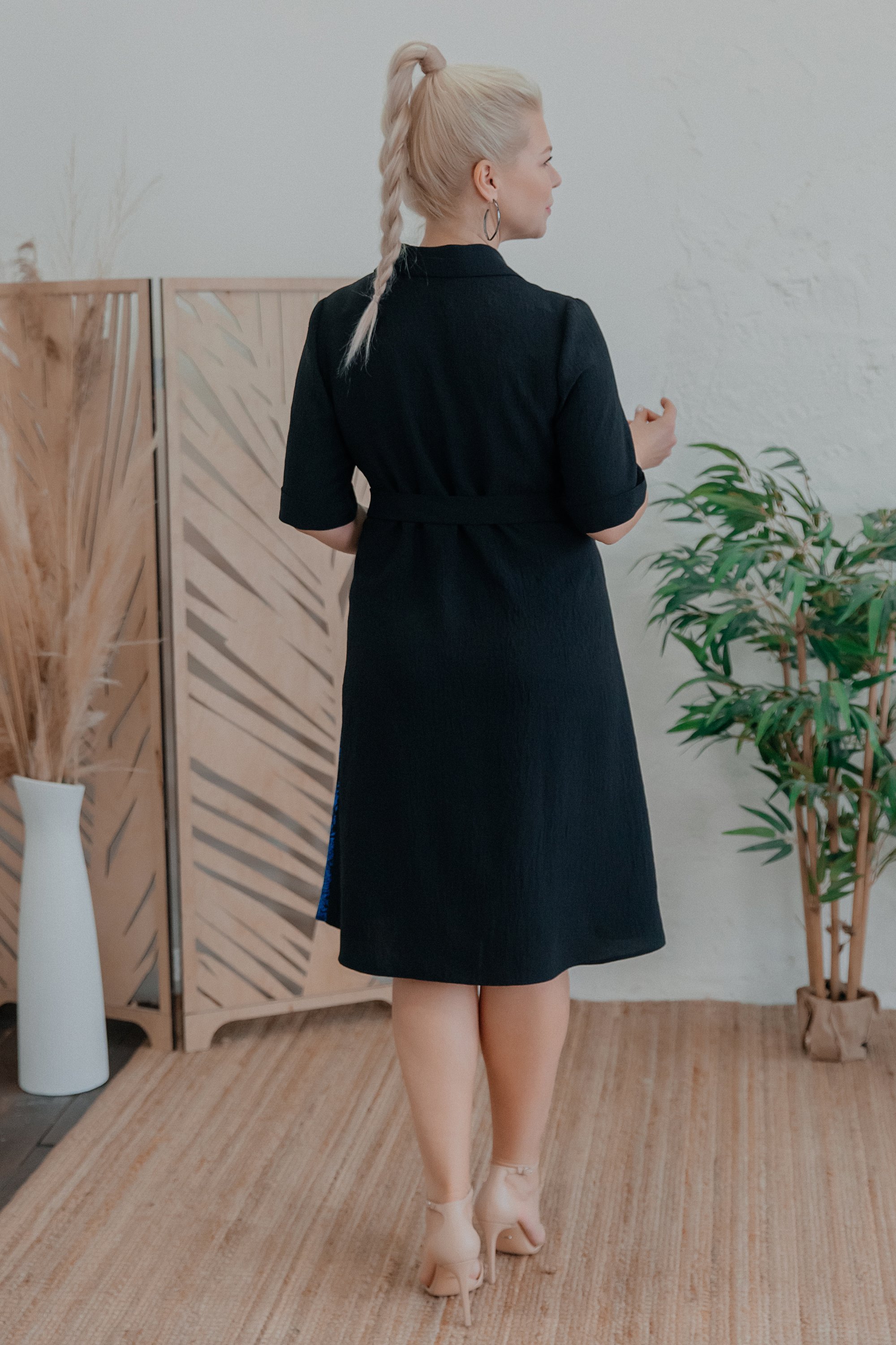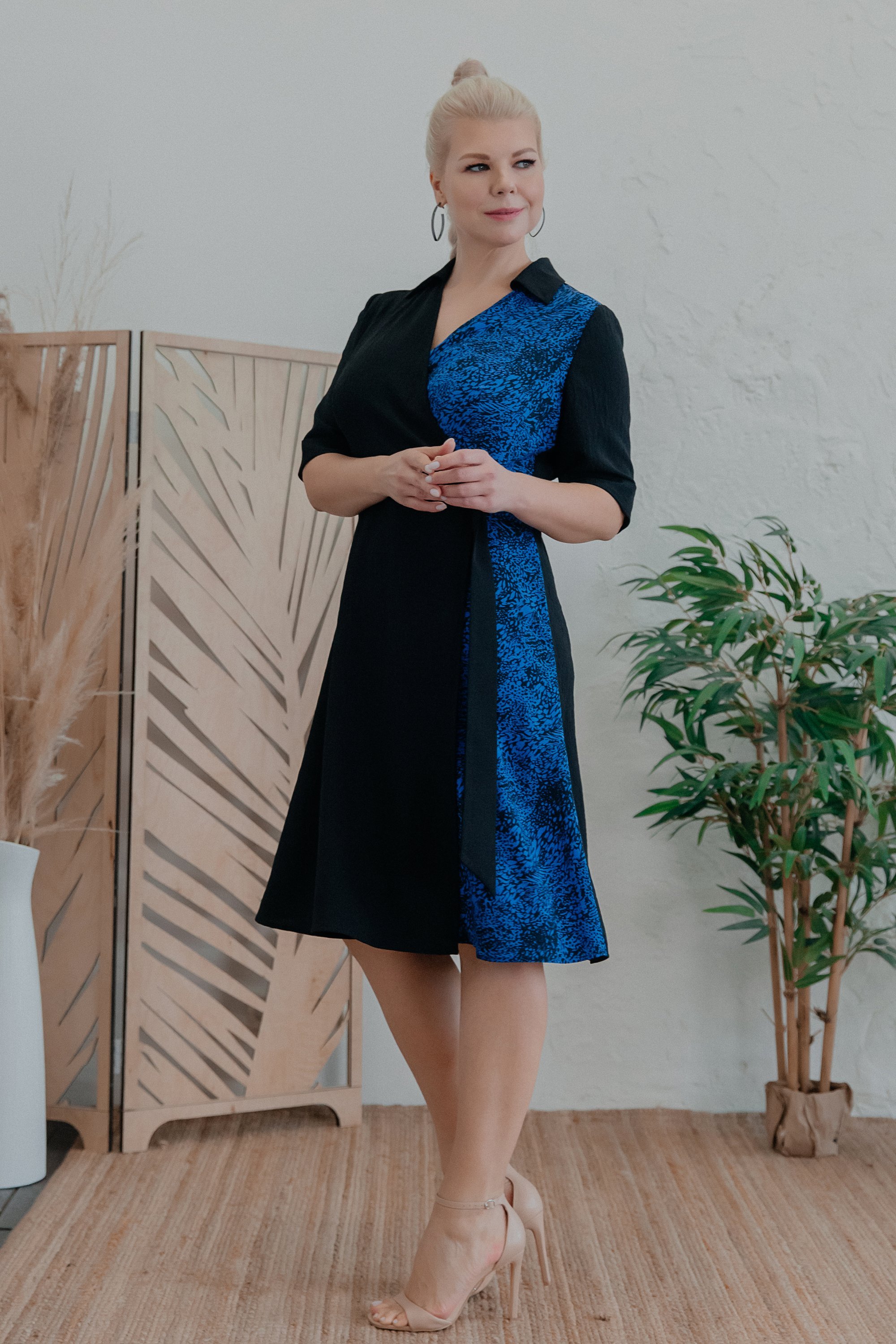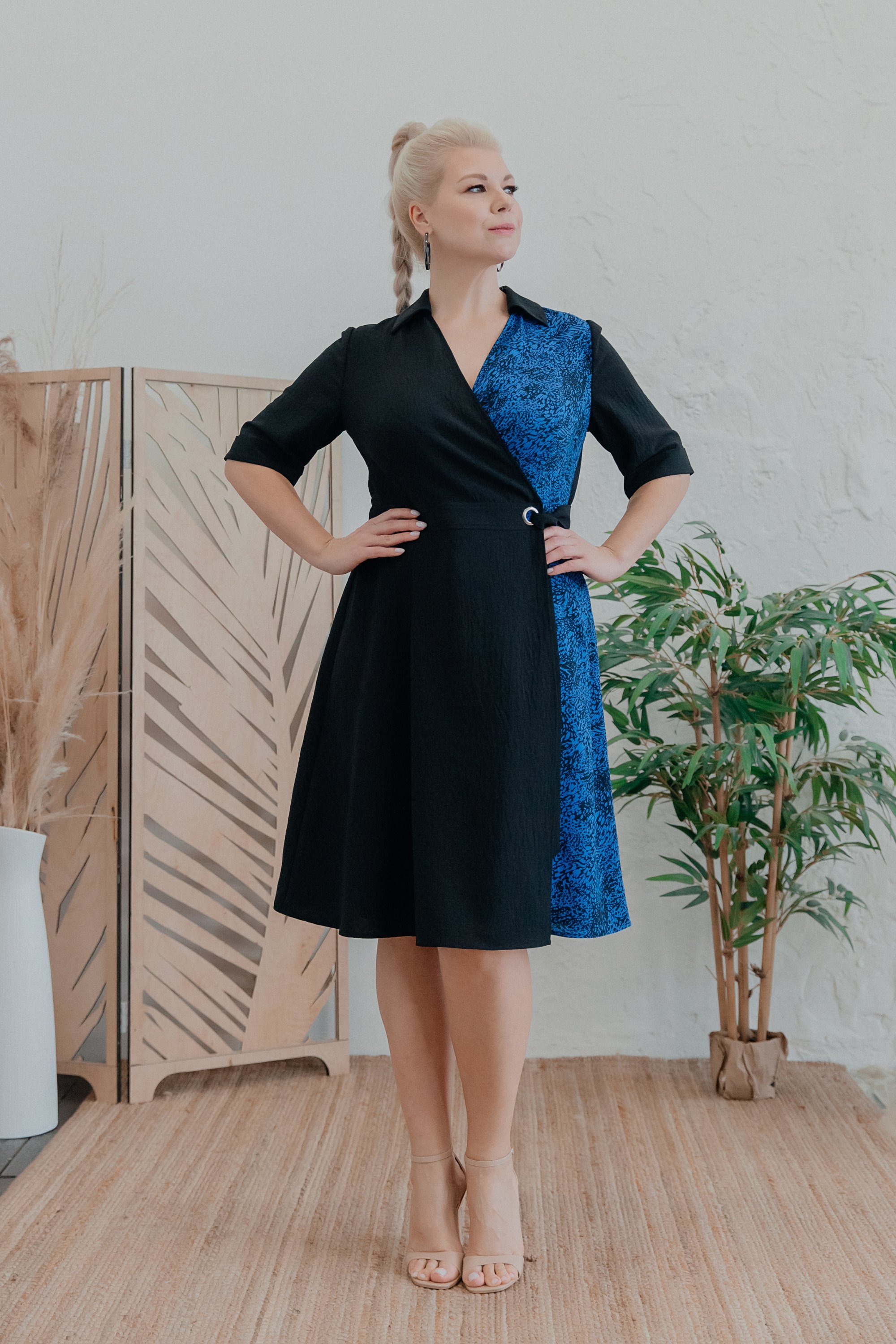 Платье полуприлегающего силуэта с коротким рукавом с притач-ной манжетой и отрезным лифом по переду. Горловина V-образная с рубашечным воротником, переходящая в запах и пояс. По ниж-ней части переда – односторонние складки. Длина изделия по спинке: 103 см Тип рукава: короткий