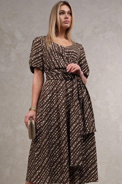 Платье длиной до середины икры А-силуэта, отрезное по линии талии. Фигурный вырез горловины переходит в пояс-завязку. Рукав короткий, в боковых швах кармана.