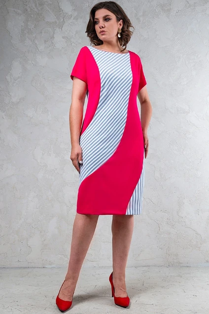 Платье женское летнее повседневное свободного силуэта, длиной до середины колена с цельнокроеным коротким рукавом, без застежки. Перед с фигурными линиями. Спинка со средним швом и разрезом