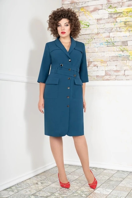 Элегантное платье полуприлегающего силуэта. Ткань костюмно-плательная средней плотности, немного тянется. Застежка на пуговицы спереди. На переде накладные карманы. Длина изделия по спинке в 48-50-52 размрах 104 см, в 54-56-58 размерах 106 см. Длина рукава 43 и 46 см соответственно.