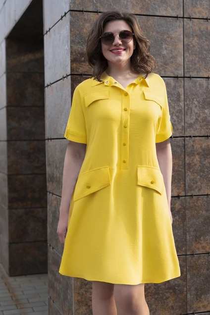 Платье А-силуэта. Ткань немного тянется. Застежка на кнопки спереди. В боковых швах удобные карманы. Длина платья 90 см.