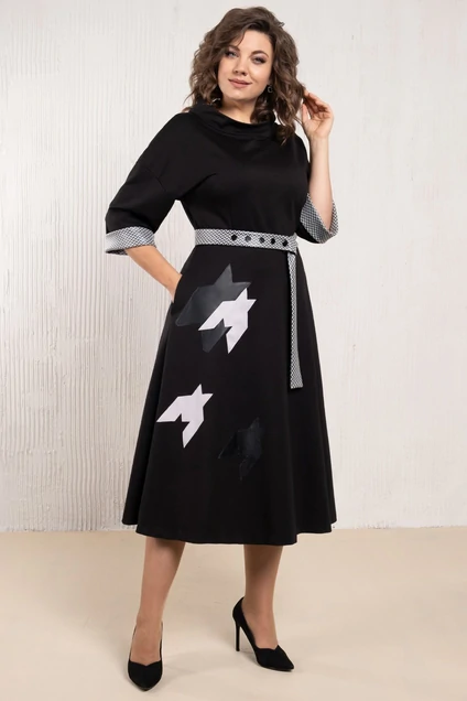Элегантное трикотажное платье с аппликациями. Трикотаж средней плотности, хорошо тянется. На переде разрез. Юбка колокол, рукав втачной на спущенной пройме. В боковых швах удобные карманы. Пояс съемный. Длина изделия по спинке в 46-50 размерах 118 см, в 52-56 размерах 123 см. Платье подойдет на рост 164-170см.