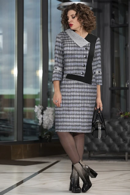 Трикотажное платье полуприлегающего силуэта. Трикотаж плотный, но эластичный. В среднем шве спинки шлица, рукав втачной. Длина 100 см, рукав 46 см.