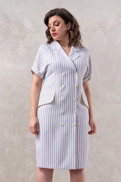 Элегантное платье полуприлегающего силуэта из костюмно-плательной ткани средней плотности, немного тянется. Застежка спереди на кнопки. На переде имитация карманов. Рукав цельнокроеный. Длина по спинке в 48-50-52 размерах 100 см, в 54-56-58 размерах 103 см.