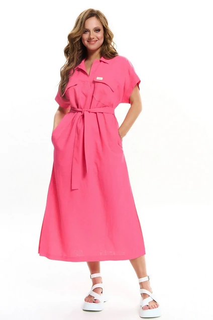Платье-рубашка из льняной ткани, свободного силуэта, слегка расширенное к низу, с цельнокроеным коротким рукавом, оригинальным воротником с лацканами, удобными боковыми и отделочными нагрудными карманами. По боковым швам - разрезы, пояс - съемный.
