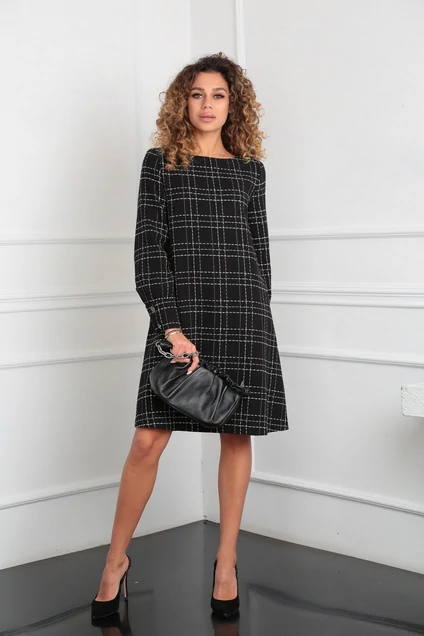 Стильное молодежное платье трапециевидного силуэта из рогожки в стиле «Chanel», выгодно подчеркивает достоинства фигуры, скрывая при этом недостатки. Вырез горловины округлой формы. По переду изделия выполнены нагрудные вытачки. Рукав втачной, длинный. По низу рукава имеется притачная манжета, застегивающаяся на ряд пуговиц. По спинке выполнена широкая складка с расположенными по ней пуговицами. Изделие выполнено на трикотажной подкладке.