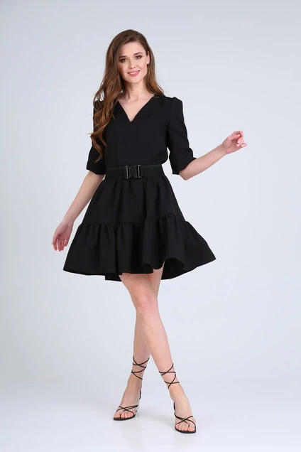 Нет ничего прекраснее, чем маленькое черное платье, которое просто незаменимо для создания модного лука. Изделие А-образного силуэта, отрезное по линии талии с воланом и сборкой по низу, что делает образ обладательницы платья очень женственным и хрупким. Рукав втачной одношовный. Длина ¾ на манжете с эластичной тесьмой. Горловина округлой формы с потайной застежкой молнией, расходящейся вверху в треугольный вырез. Лиф платья обработан нагрудными и таллиевыми выточками. К платью прилагается съемный эластичный пояс с пряжкой.